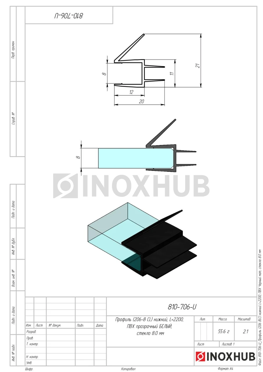 Профиль (206-8 BLC) нижний, L=2200, стекло 8.0 мм, ПВХ Черный мат