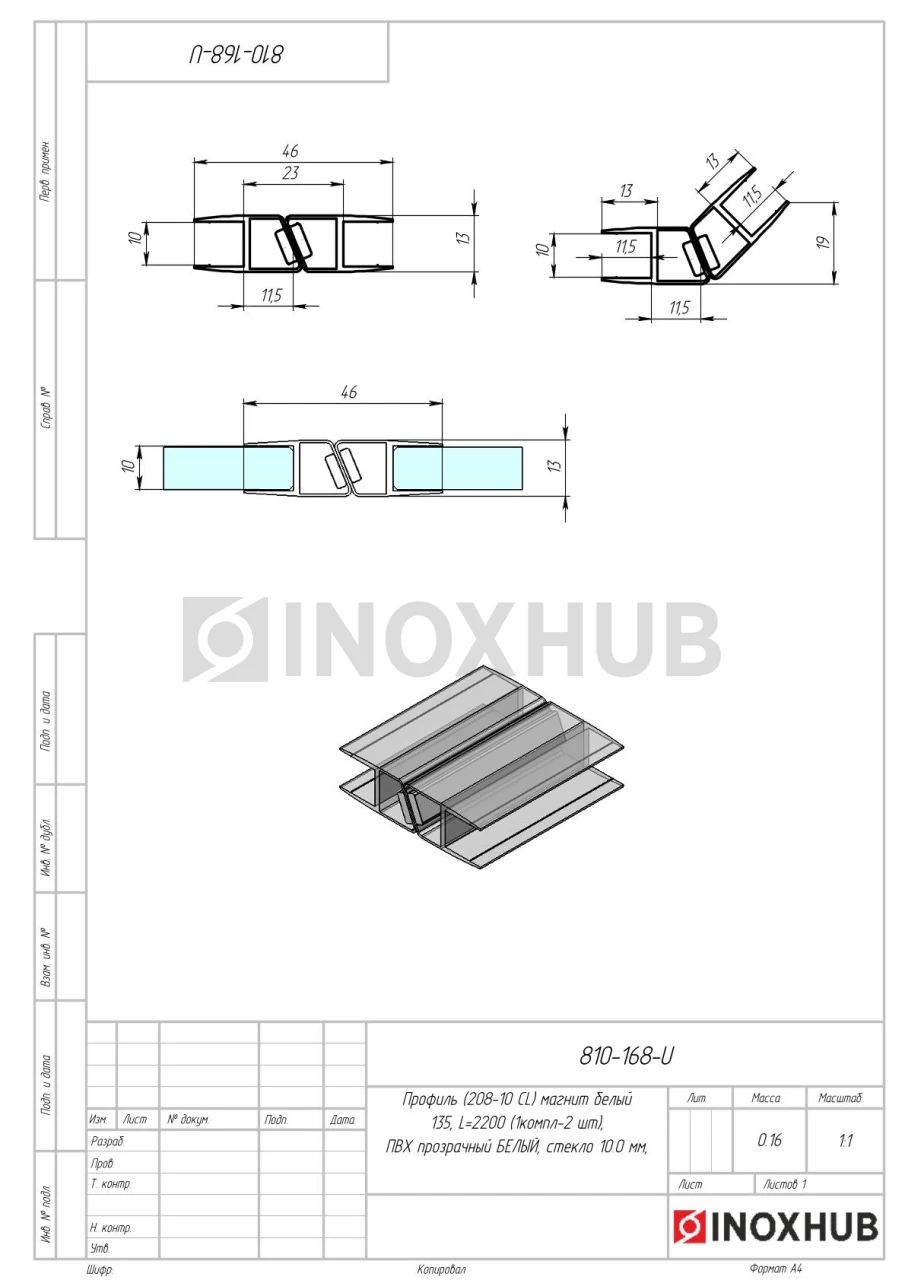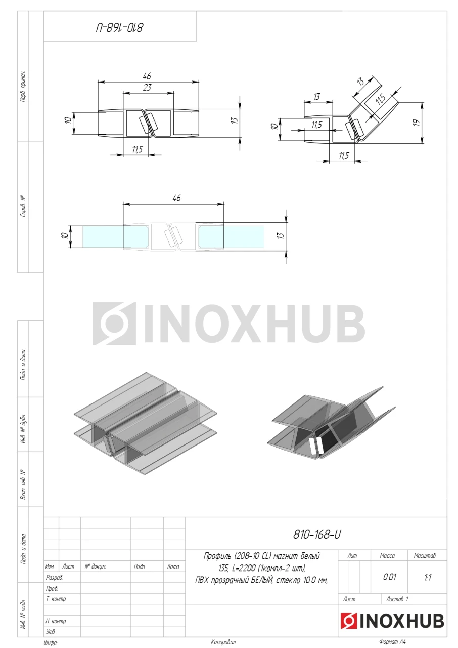 Профиль (208-10 CL) магнит белый 135º, L=2200 (1компл/2 шт), стекло 10.0 мм, ПВХ прозрачный БЕЛЫЙ