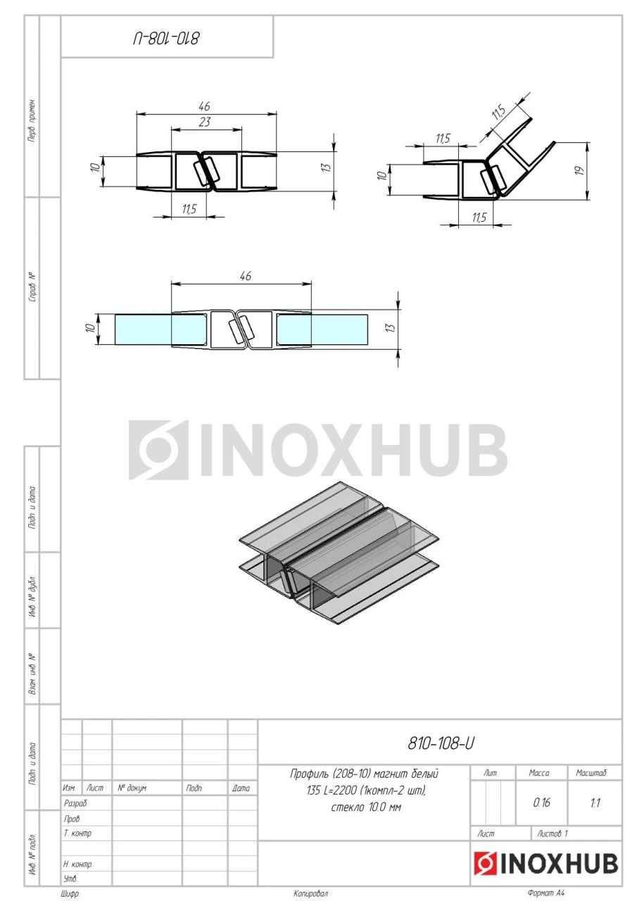 Профиль (208-10) магнит белый 135º, L=2200 (1компл/2 шт), стекло 10.0 мм