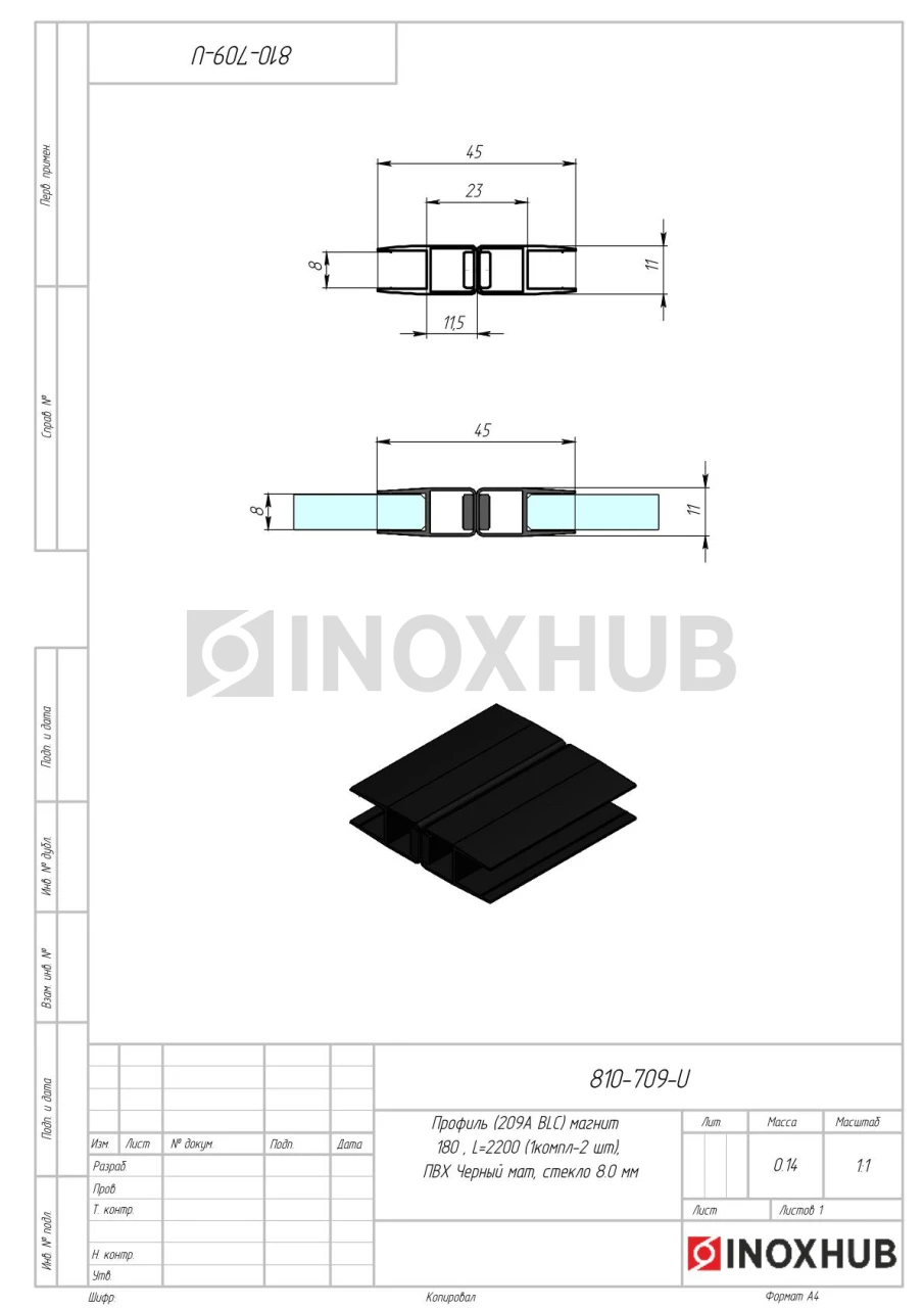 Профиль (209А-8 BLC) магнит 180º, L=2200 (1компл/2 шт), стекло 8.0 мм, ПВХ Черный мат