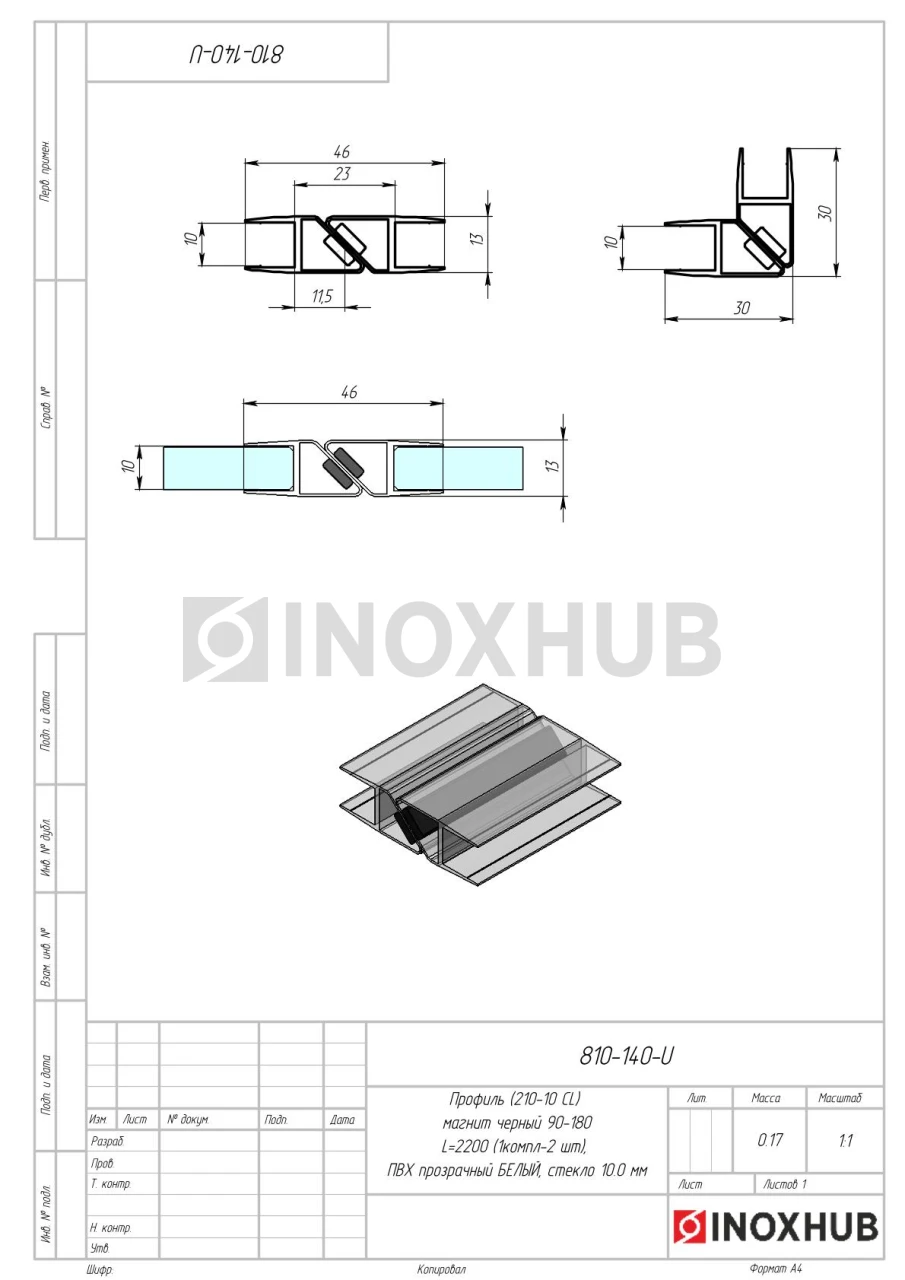 Профиль (210-10 CL) магнит черный 90º/180º, L=2200 (1компл/2 шт), стекло 10.0 мм, ПВХ прозрачный БЕЛЫЙ