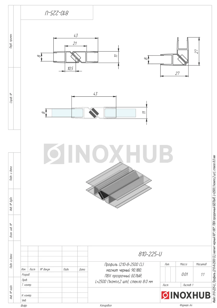 Профиль (210-8-2500 CL) магнит черный 90º/180º, L=2500 (1 компл/2шт), стекло 8.0 мм, ПВХ прозрачный БЕЛЫЙ
