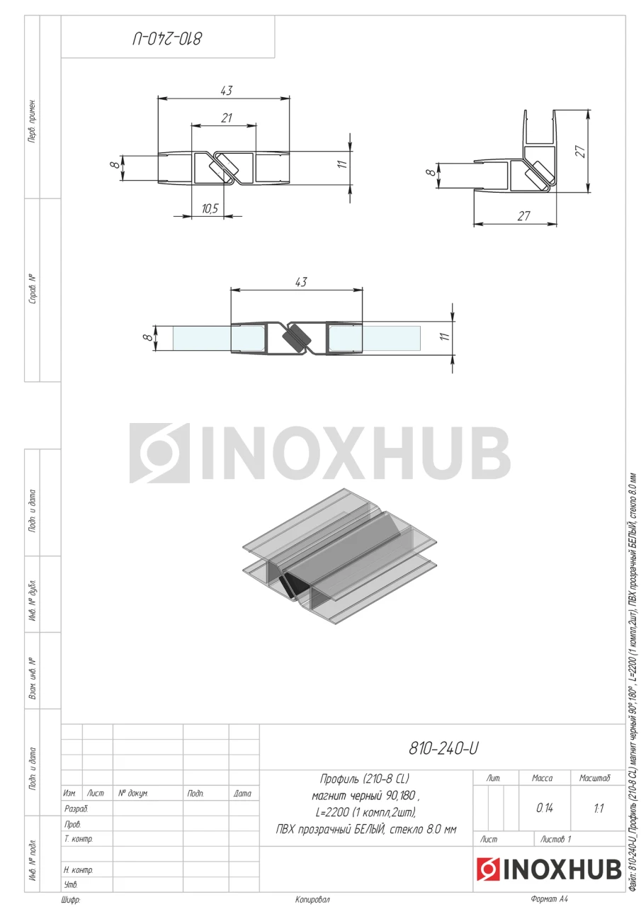 Профиль (210-8 CL) магнит черный 90º/180º, L=2200 (1 компл/2шт), стекло 8.0 мм, ПВХ прозрачный БЕЛЫЙ