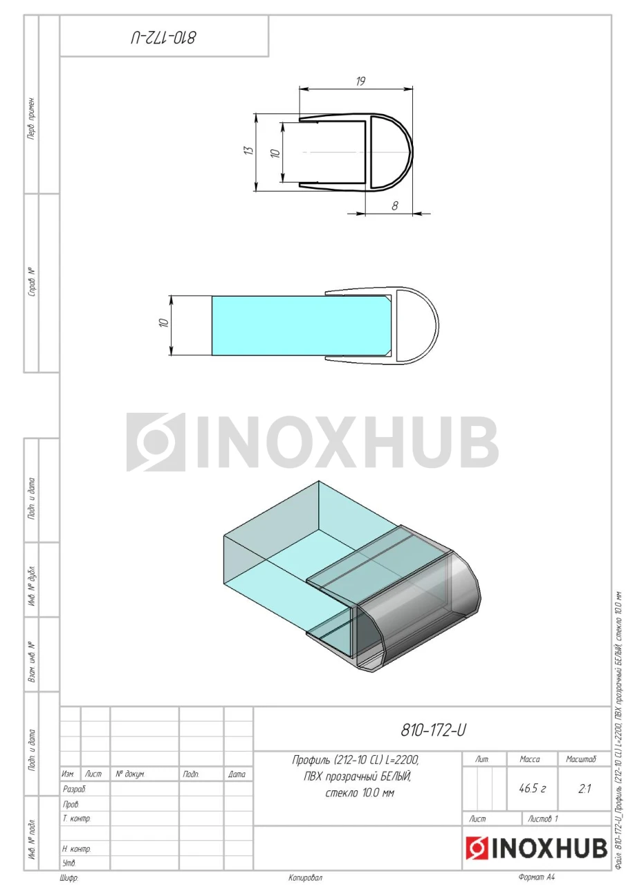 Профиль (212-10 CL), L=2200, стекло 10.0 мм, ПВХ прозрачный БЕЛЫЙ