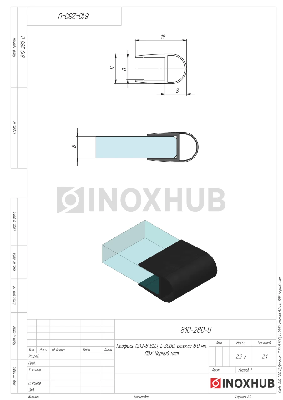 Профиль (212-8 BLC), L=3000, стекло 8.0 мм, ПВХ Черный мат