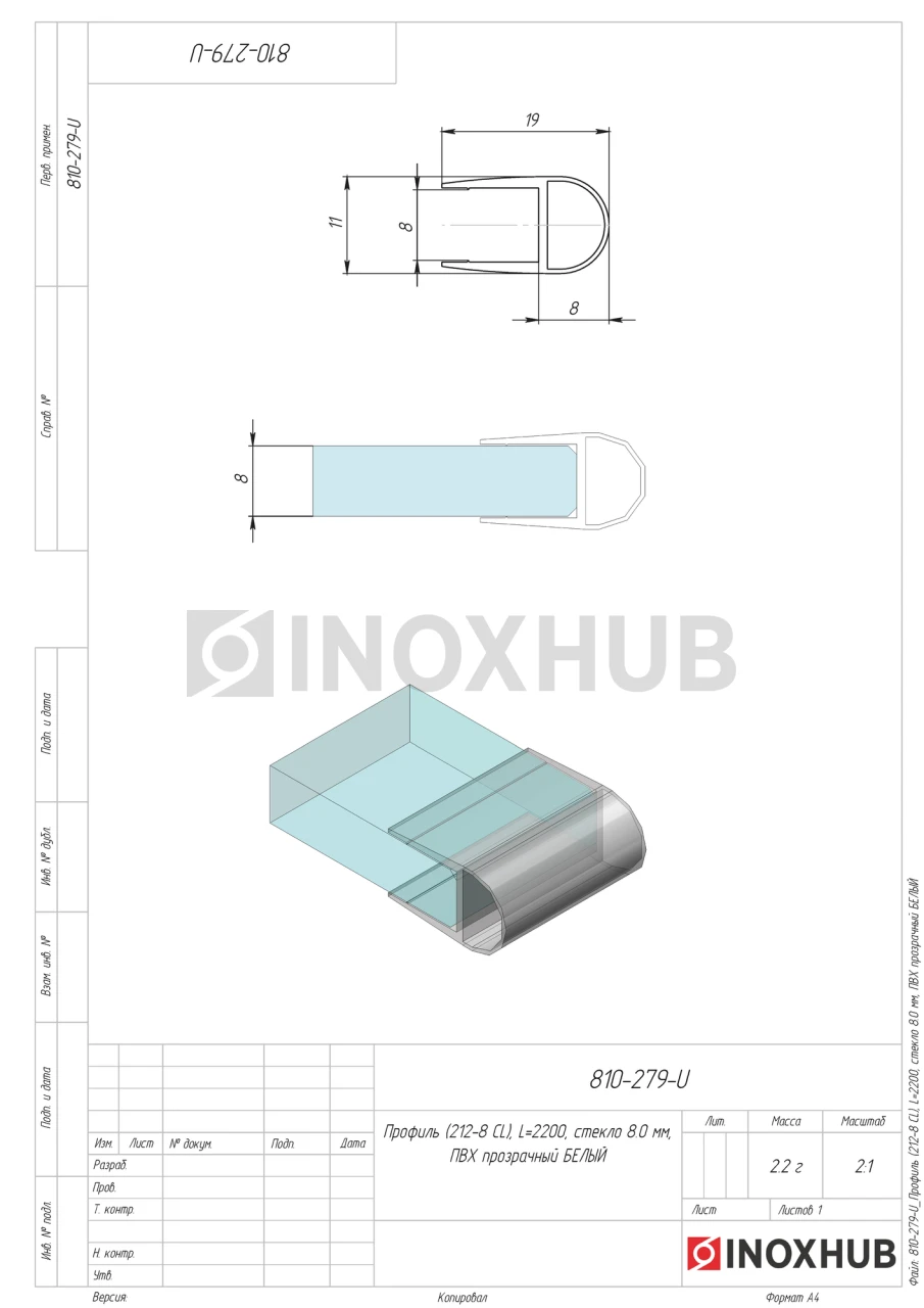 Профиль (212-8 CL), L=3000, стекло 8.0 мм, ПВХ прозрачный БЕЛЫЙ