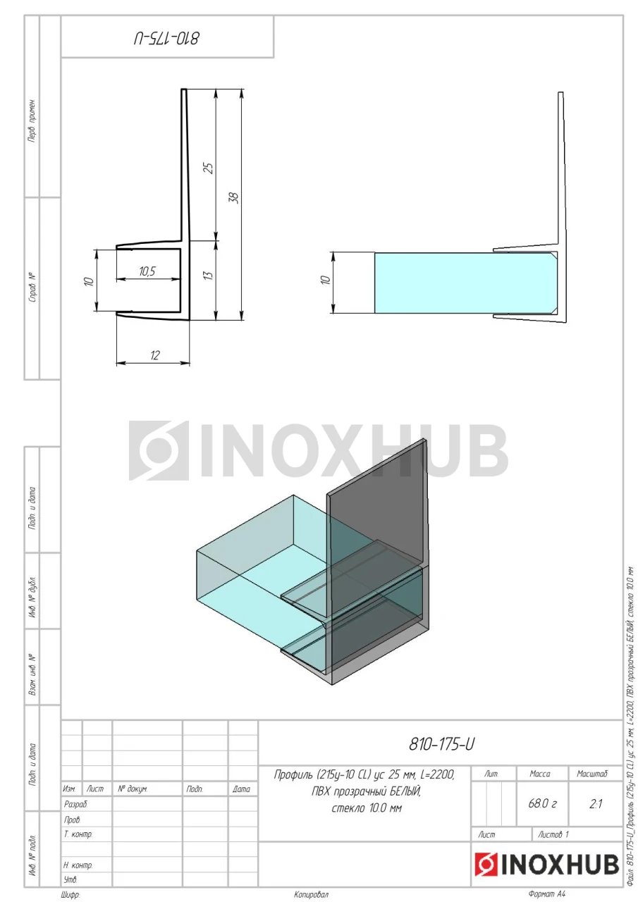 Профиль (215-10 CL) ус 25 мм, L=2200, стекло 10.0 мм, ПВХ прозрачный БЕЛЫЙ