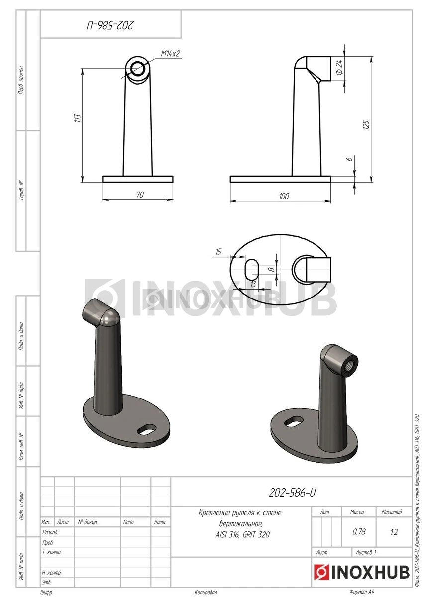 Крепление рутеля к стене вертикальное, AISI 316, GRIT 320