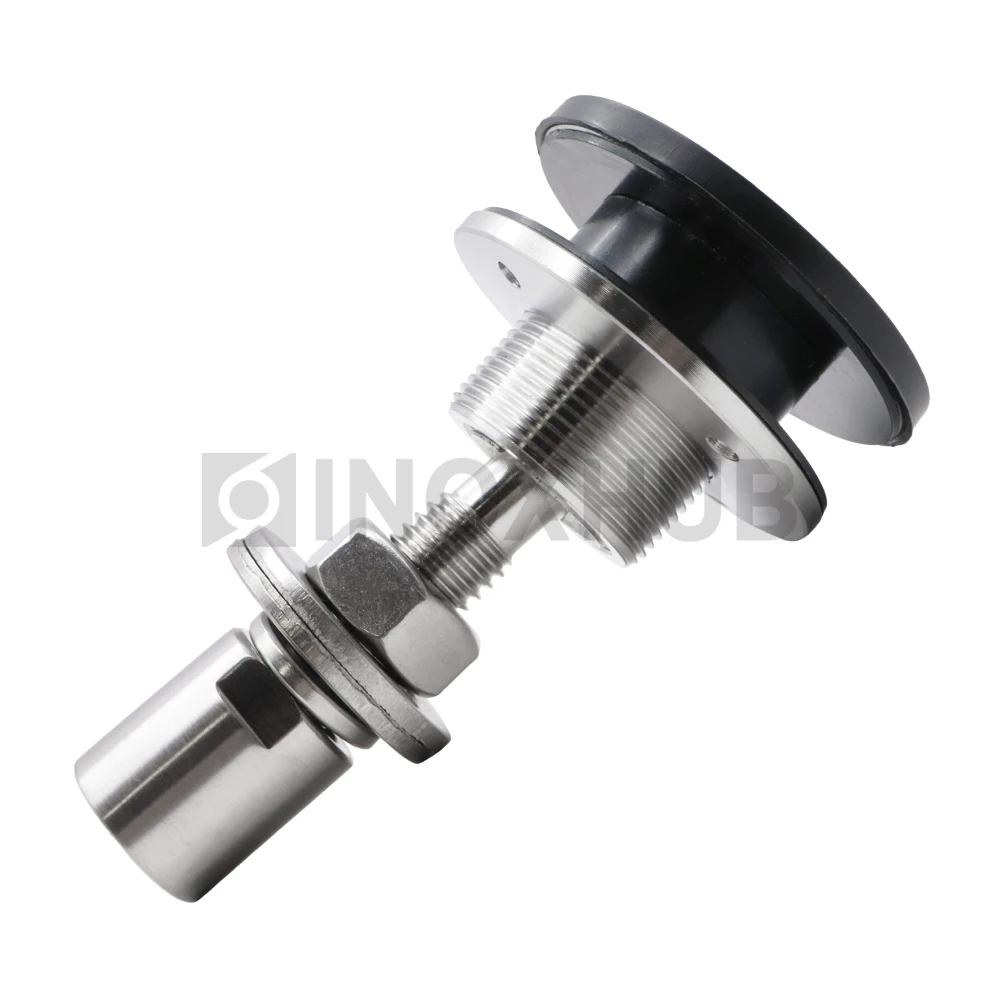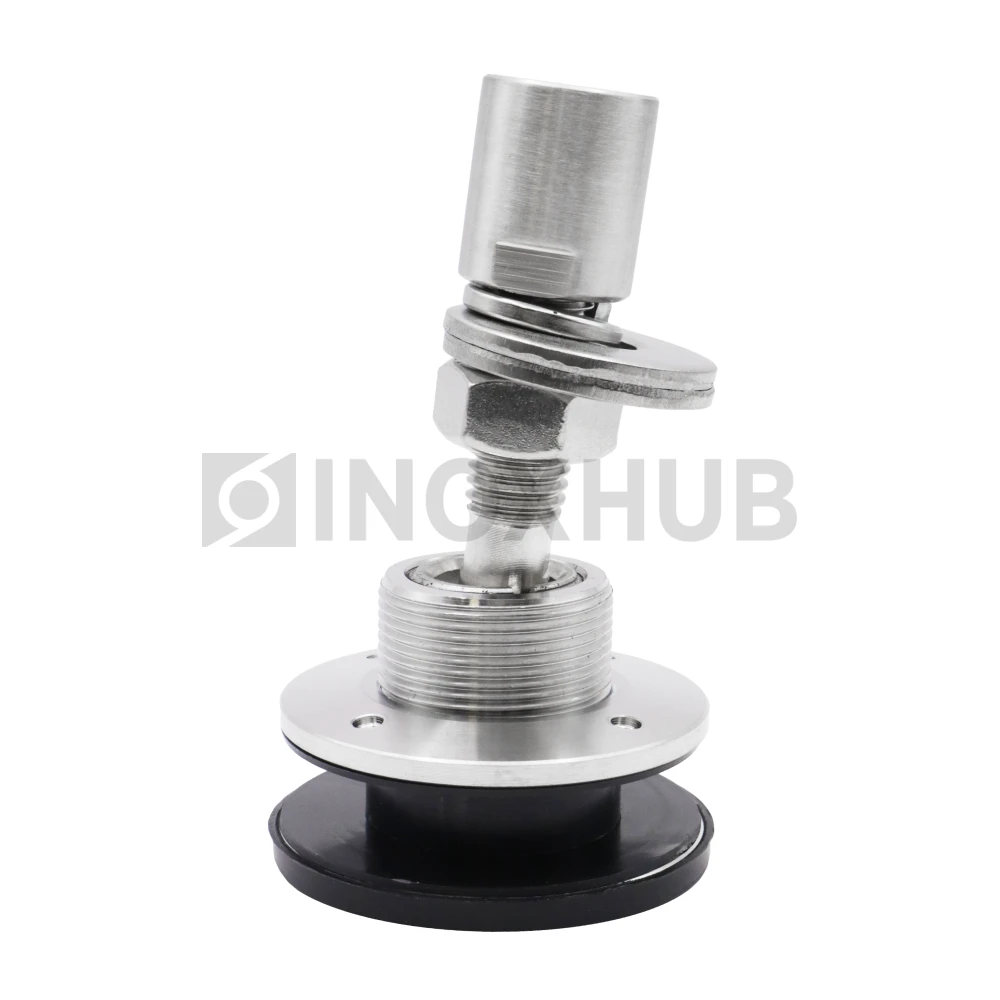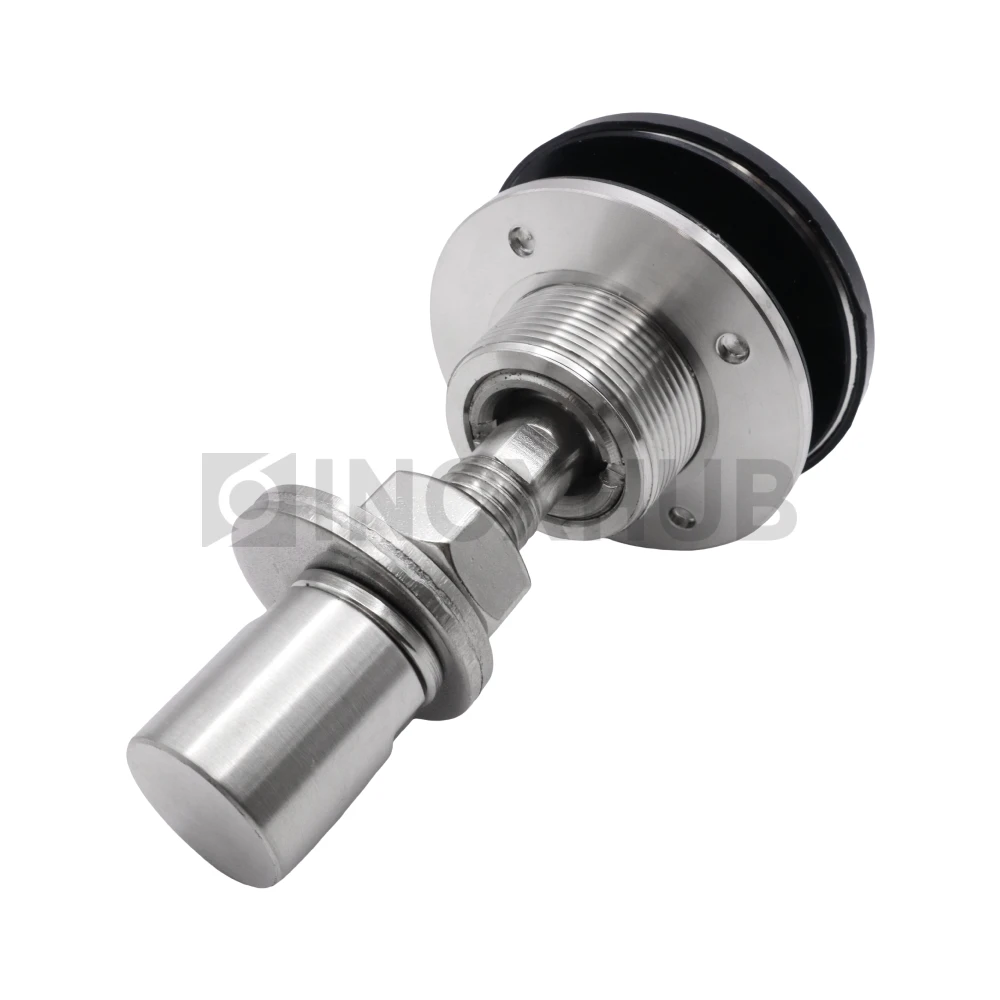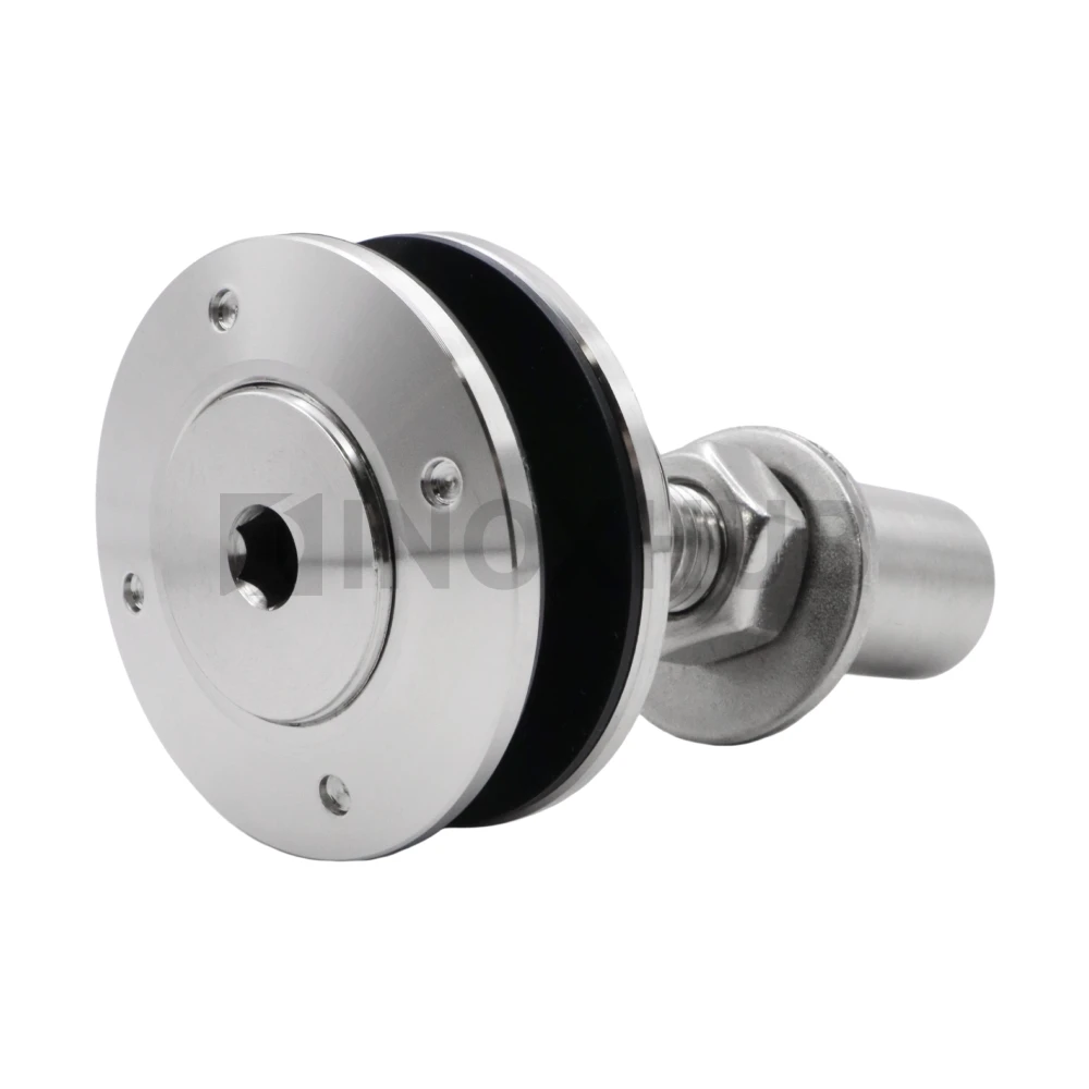 Шарнирный рутель без зенковки фиксирует стеклянное полотно толщиной 16–24 мм. Резьба М14 с шагом 2 мм. Диаметр контактной части 58 мм. Материал — нержавеющая сталь AISI 316. Сталь устойчива к коррозии в морской среде, хлорированных бассейнах и на улице. Поверхность GRIT 320 — матовая шлифовка. Конструкция включает шарнирный узел, который компенсирует угловые отклонения до нескольких градусов. Уплотнители предотвращают прямой контакт стекла с металлом. Рутель передает нагрузку равномерно, снижает риск локального разрушения стекла.