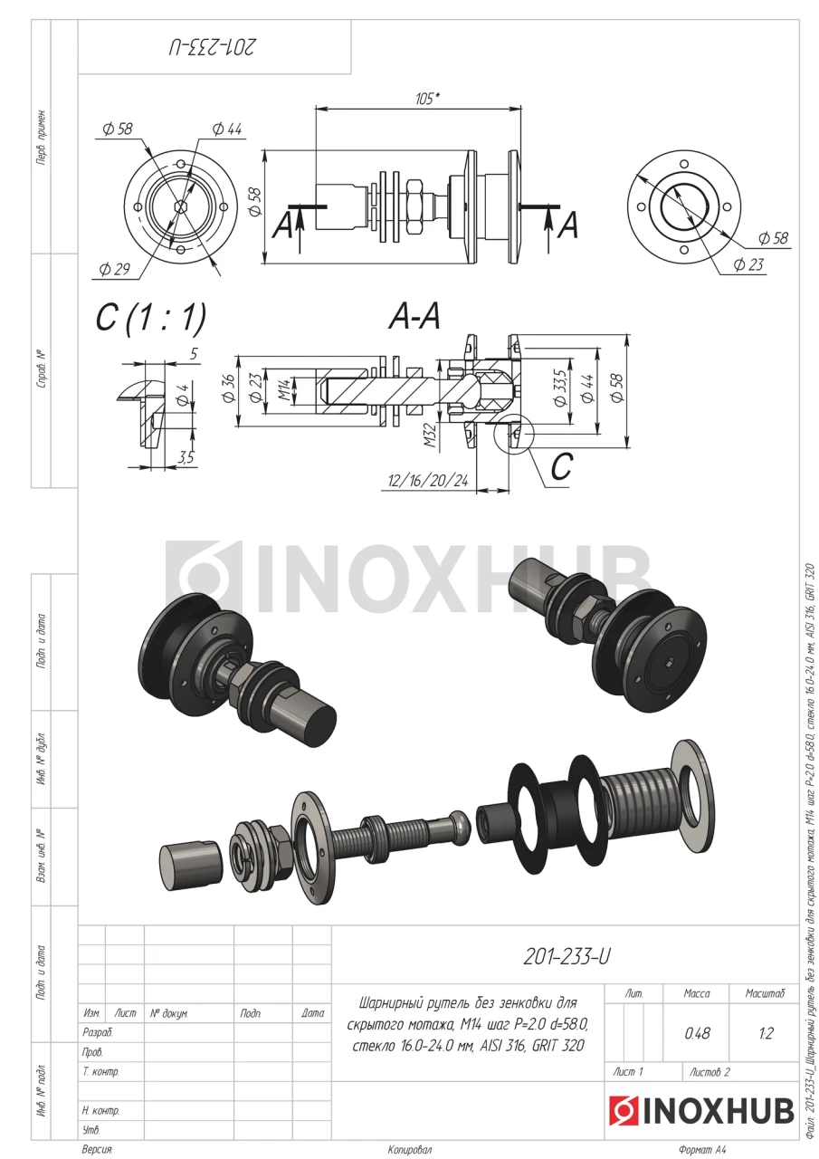 Шарнирный рутель без зенковки для скрытого монтажа, М14 шаг Р=2 d=58.0, стекло 16.0-24.0 мм, AISI 316, GRIT 320