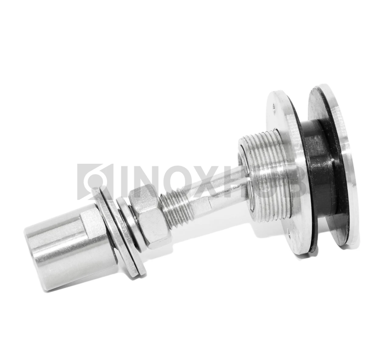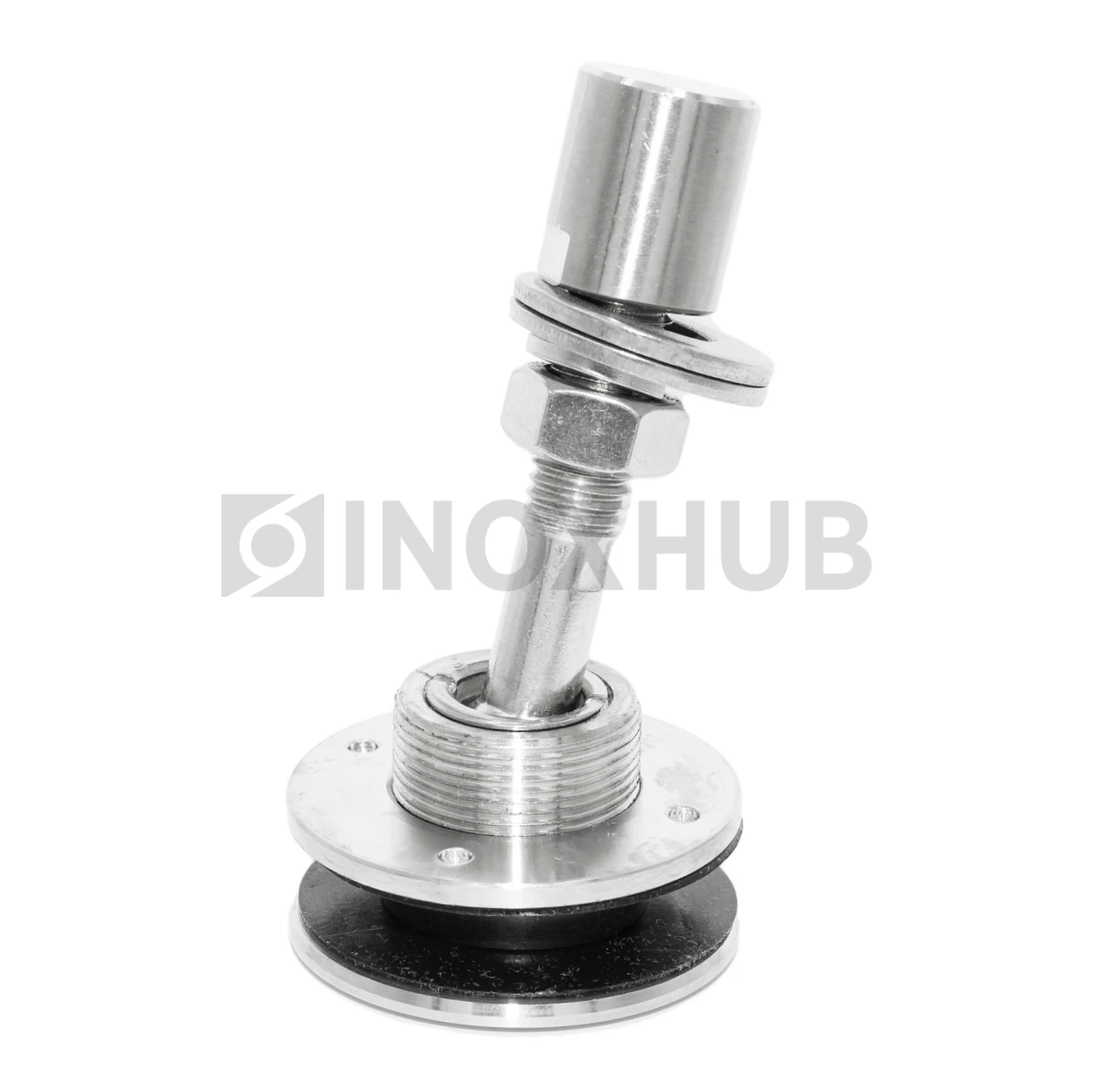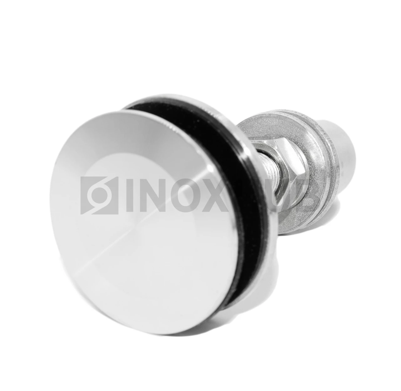 Шарнирный рутель без зенковки фиксирует стеклянное полотно толщиной 12–22 мм. Резьба М14 с шагом 2 мм. Диаметр контактной части 58 мм. Материал — нержавеющая сталь AISI 316. Сталь устойчива к коррозии в морской среде, хлорированных бассейнах и на улице. Поверхность GRIT 320 — матовая шлифовка. Конструкция включает шарнирный узел, который компенсирует угловые отклонения до нескольких градусов. Уплотнители предотвращают прямой контакт стекла с металлом. Рутель передает нагрузку равномерно, снижает риск локального разрушения стекла.