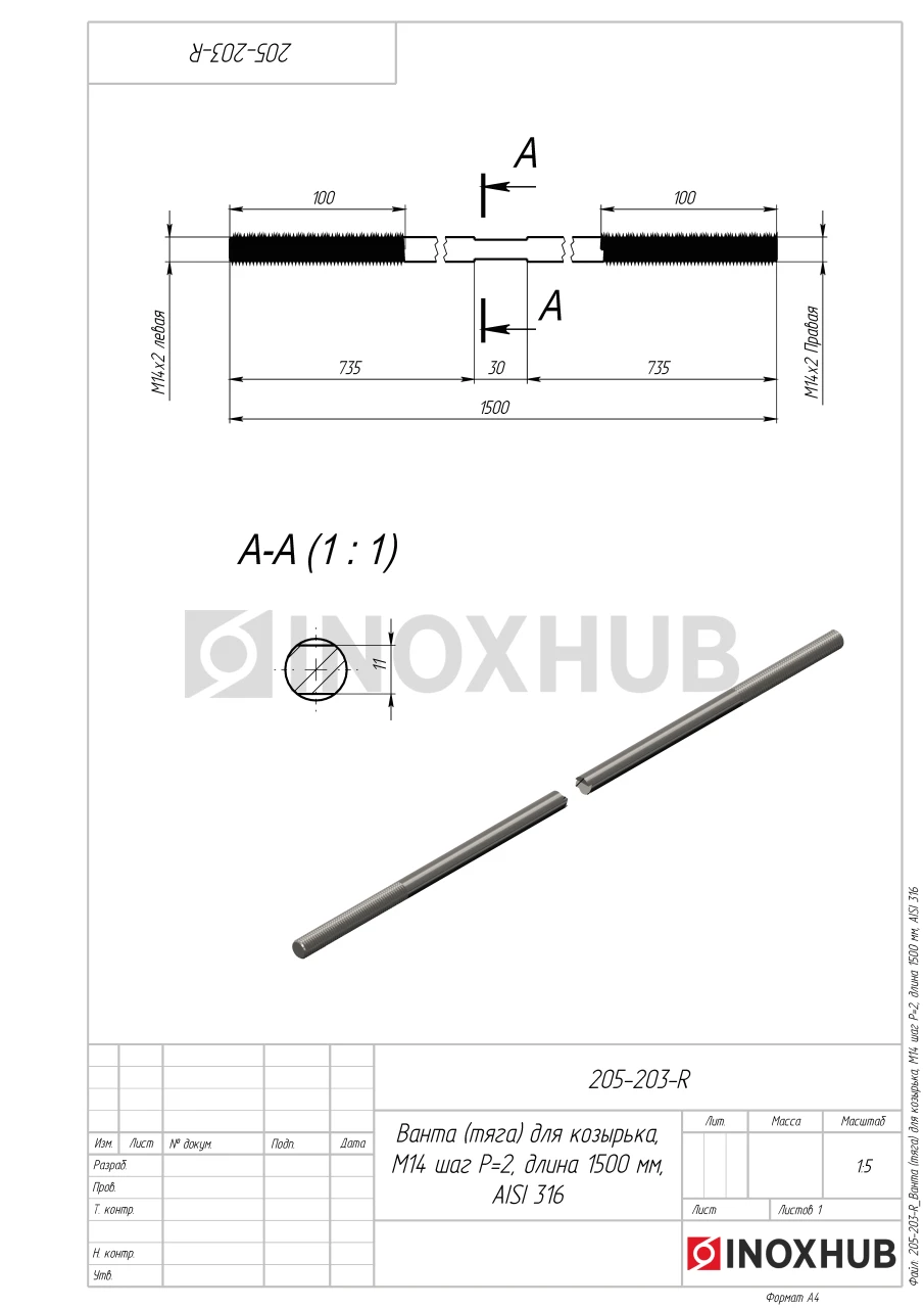 Ванта (тяга) для козырька, М14 шаг Р=2, длина 1500 мм, AISI 316
