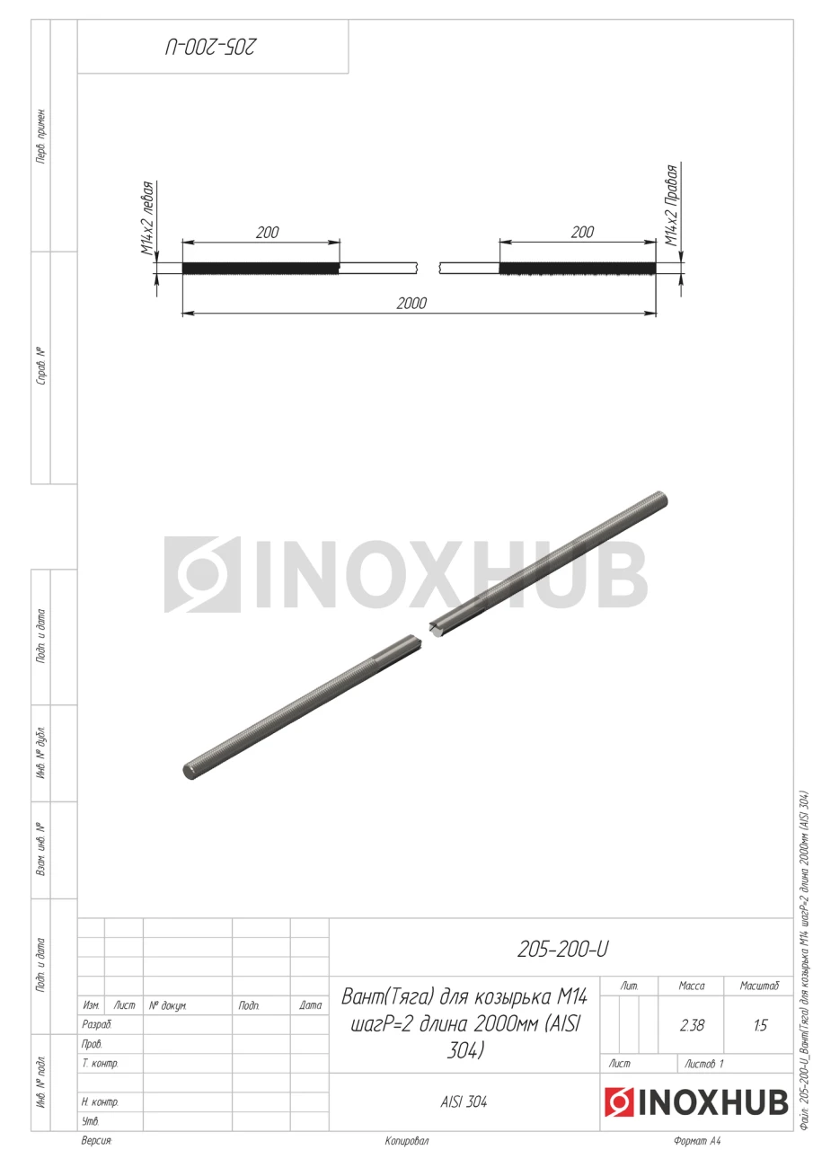 Ванта (тяга) для козырька, М14 шаг Р=2, длина 2000 мм, AISI 304