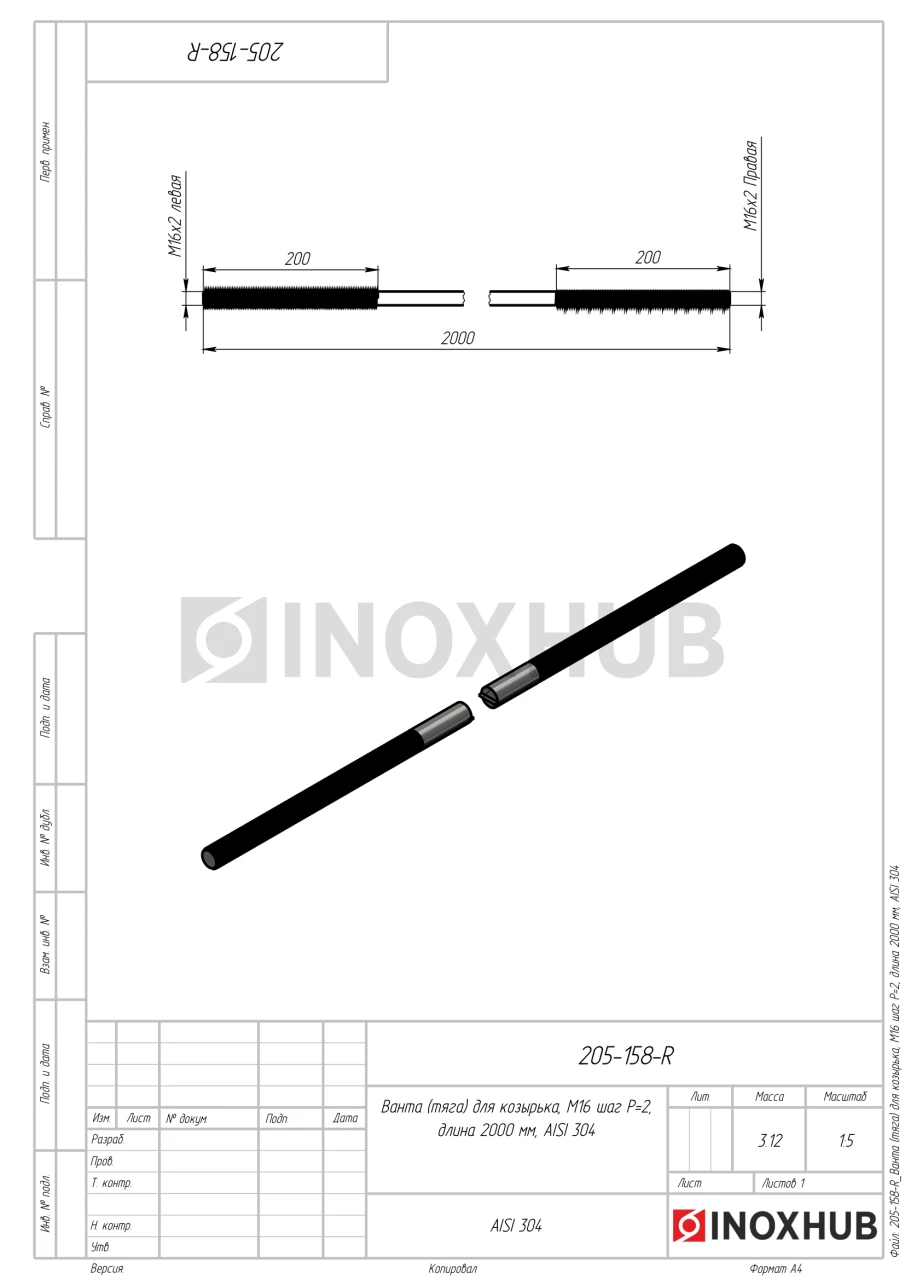 Ванта (тяга) для козырька, М16 шаг Р=2, длина 2000 мм, AISI 304