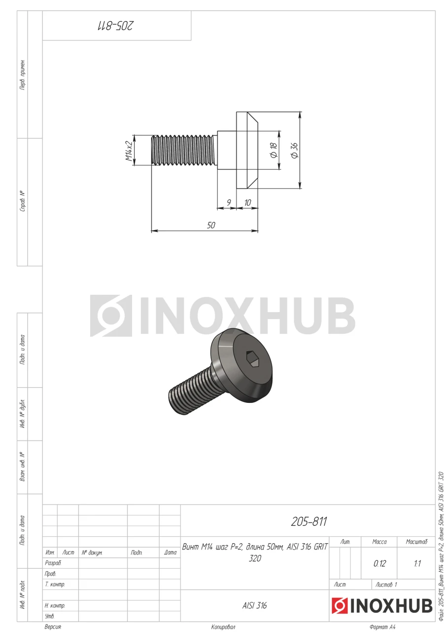 Винт М14, шаг Р=2 длина 50 мм, AISI 316, GRIT 320