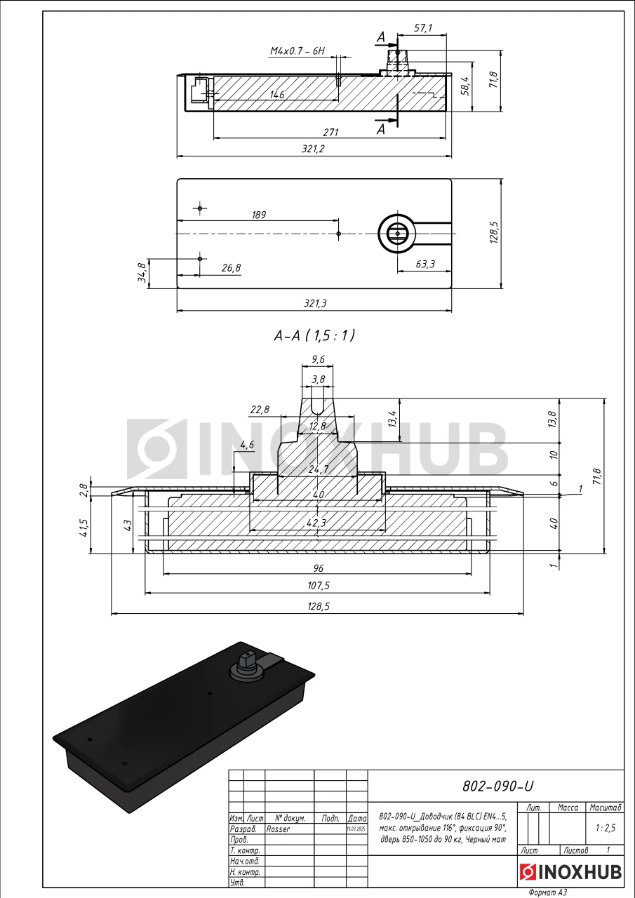 Доводчик (84 BLC) EN4...5, макс. открывание 116°, фиксация 90°, дверь 850-1050 до 90 кг, Черный мат
