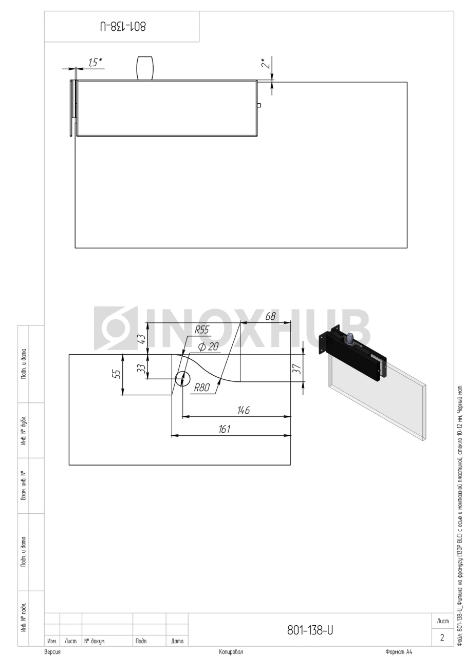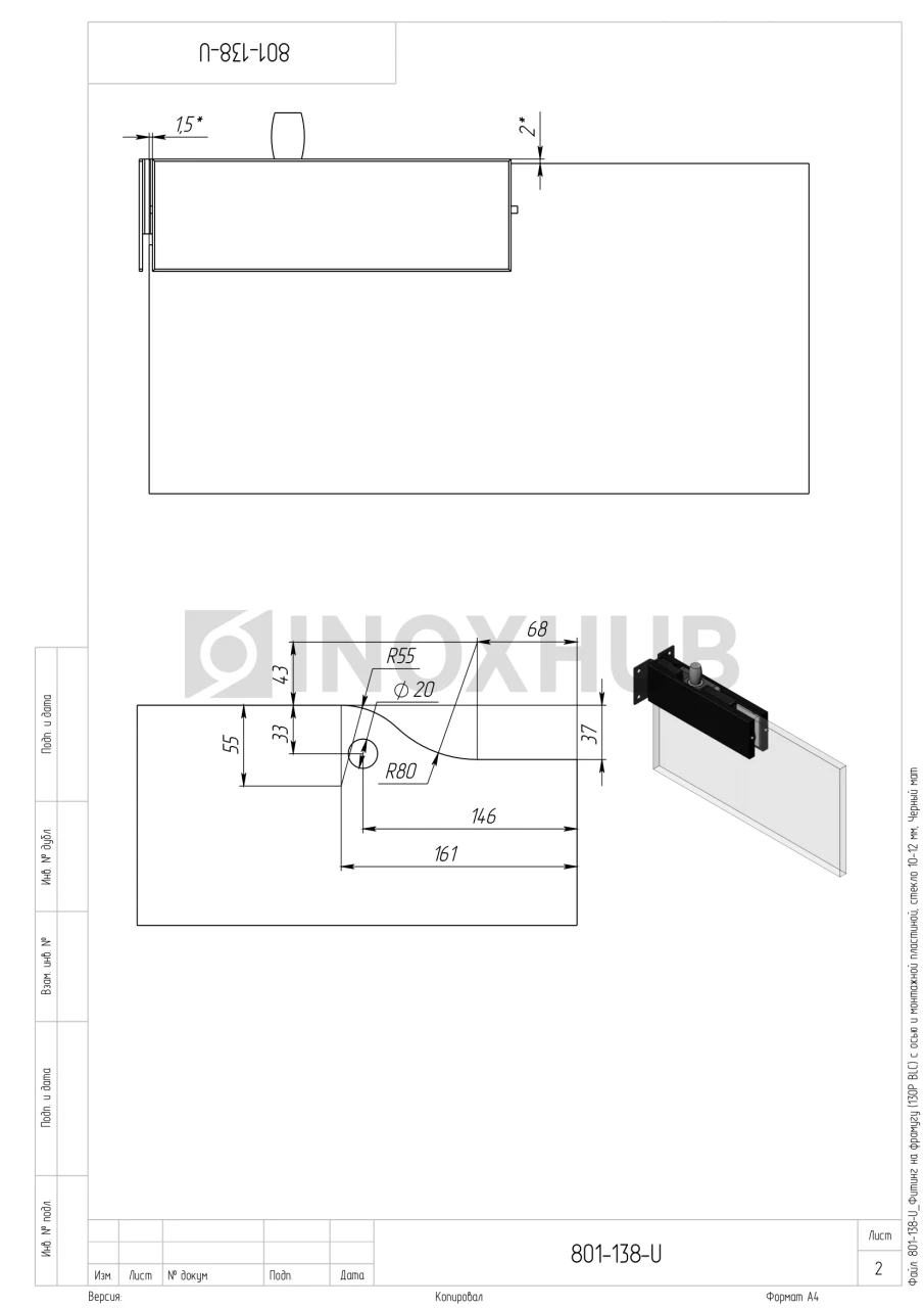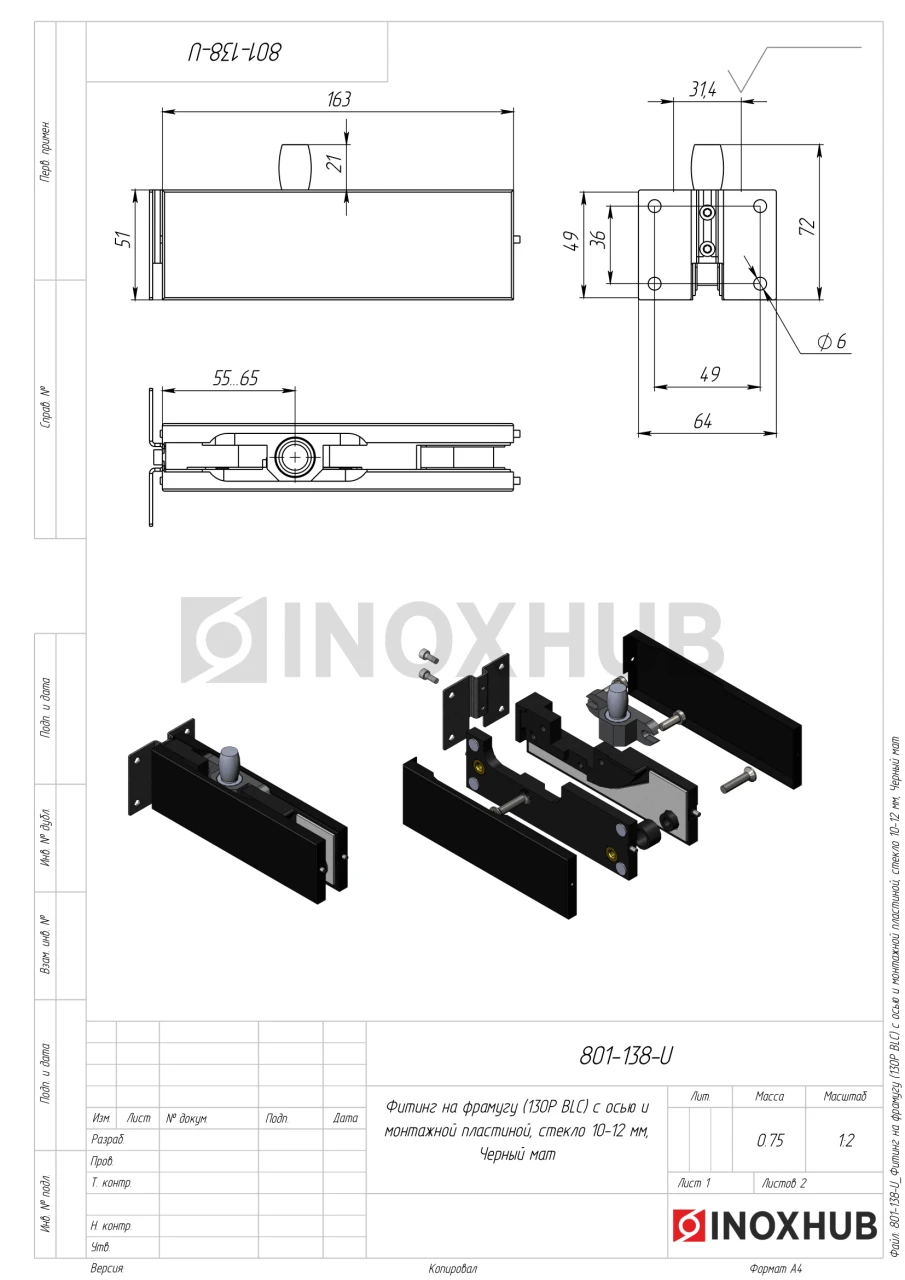 Фитинг на фрамугу (130P BLC) с осью и монтажной пластиной, стекло 10-12 мм, Черный мат