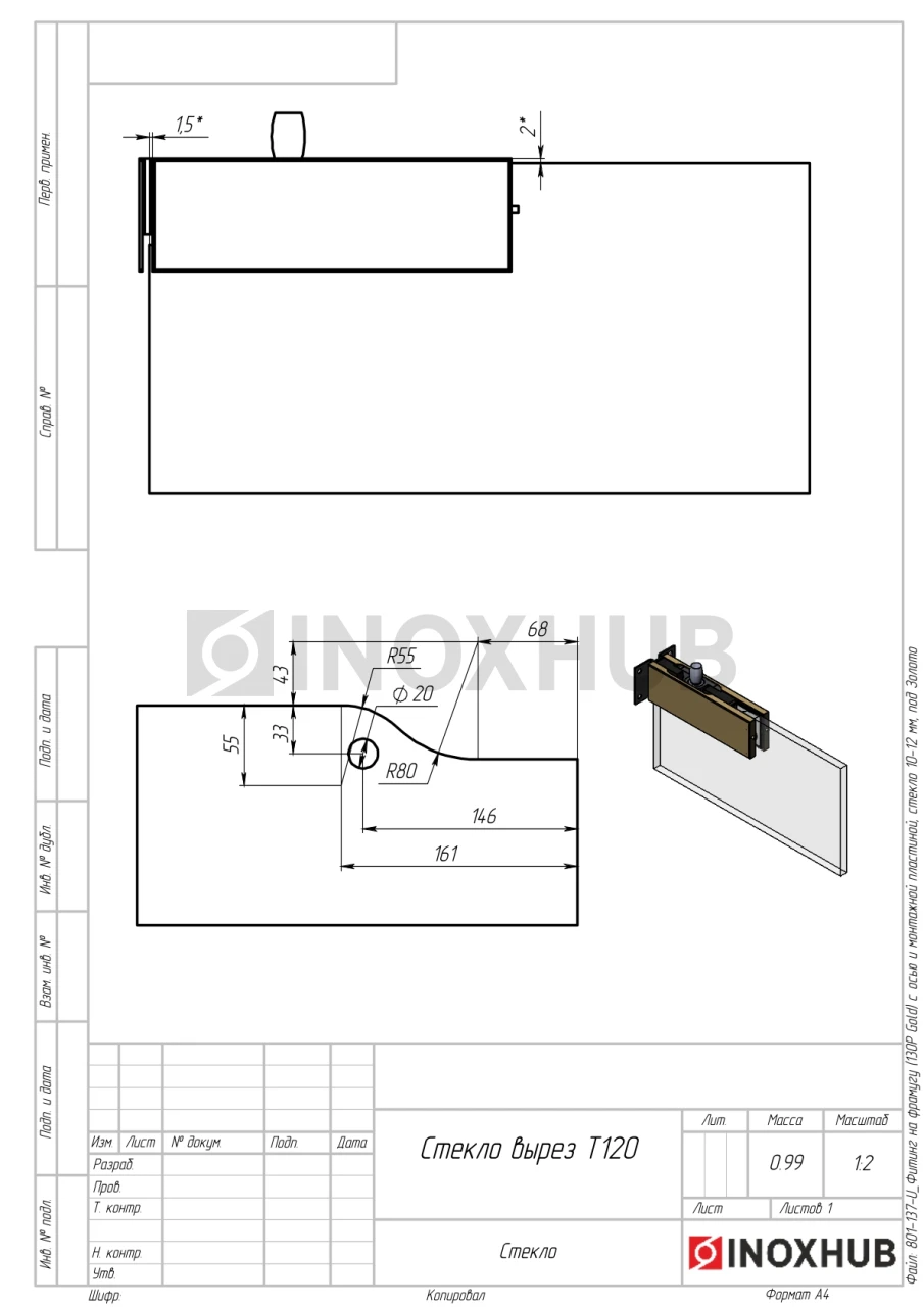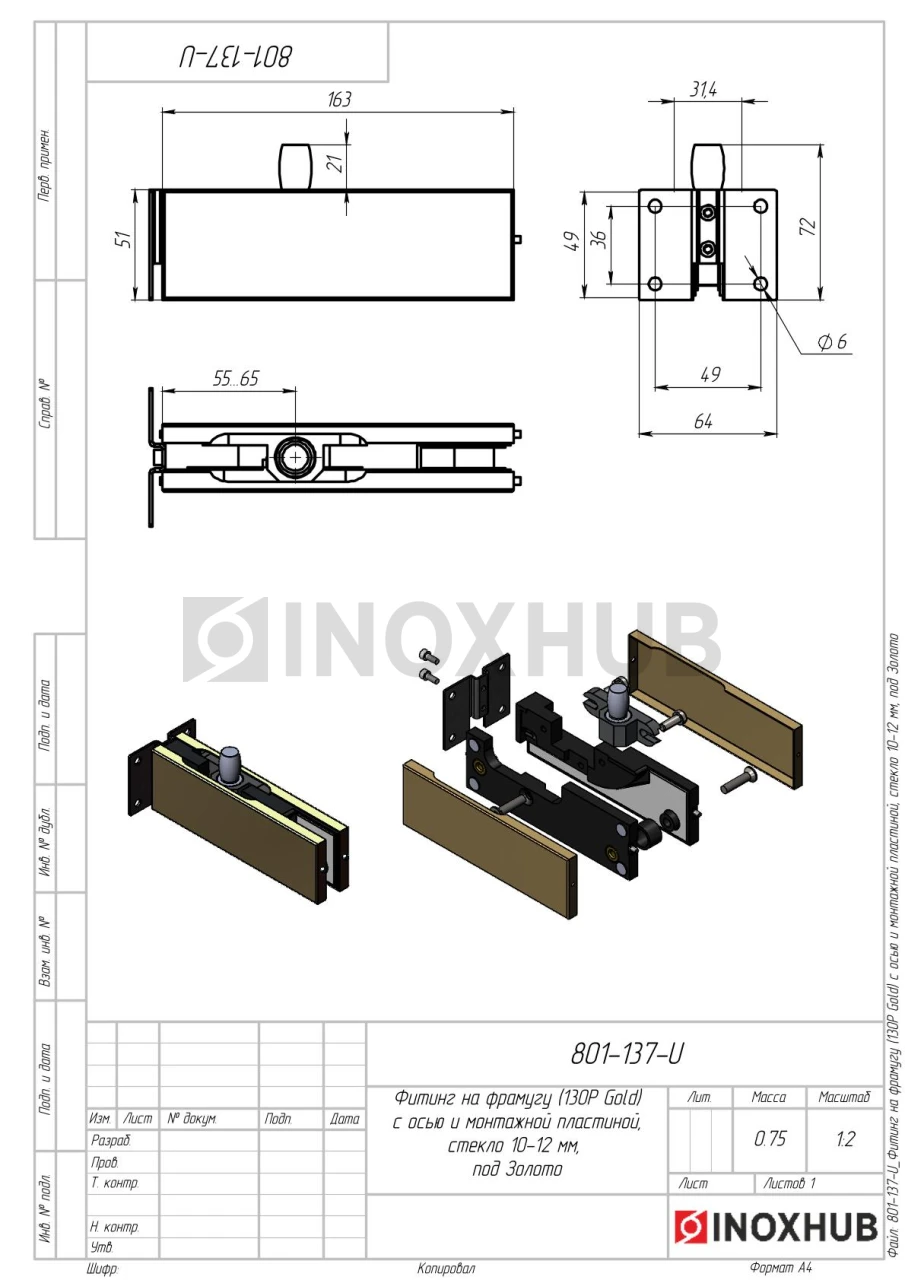 Фитинг на фрамугу (130P Gold) с осью и монтажной пластиной, стекло 10-12 мм, под Золото