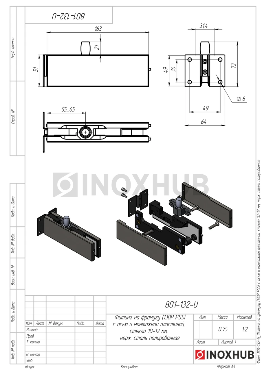 Фитинг на фрамугу (130P PSS) с осью и монтажной пластиной, стекло 10-12 мм, нерж. сталь полированная