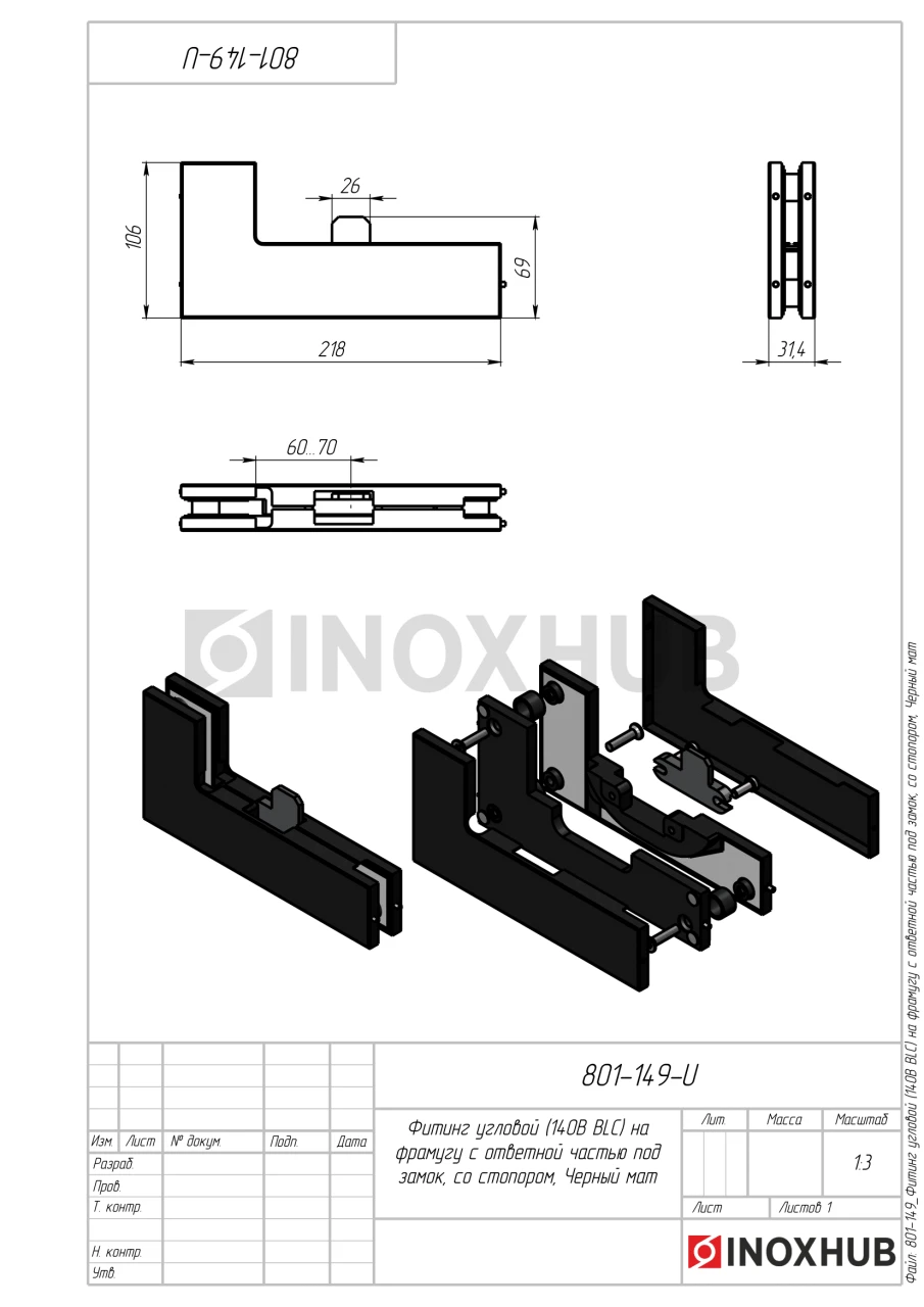 Фитинг угловой (140B BLC) на фрамугу с ответной частью под замок, со стопором, Черный мат