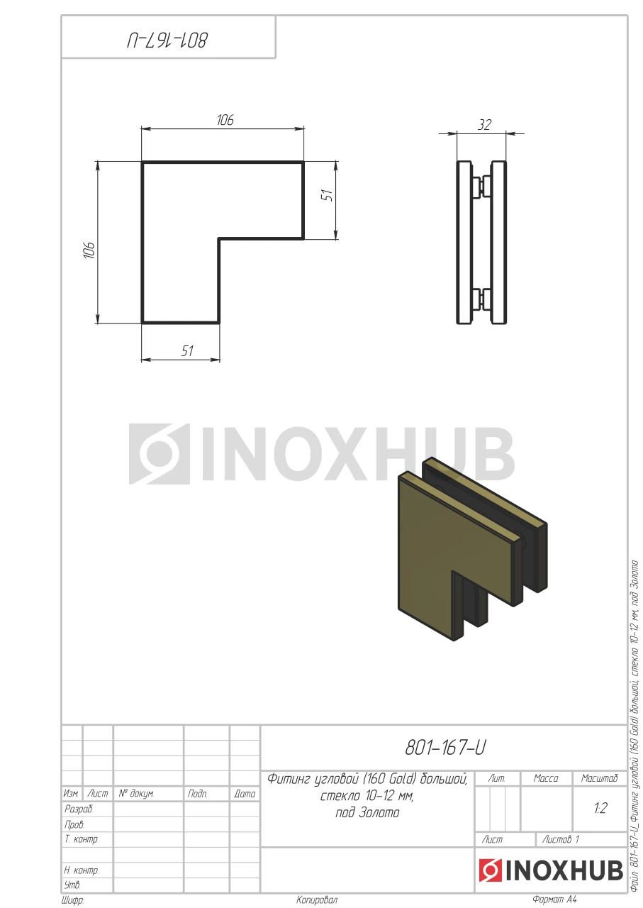 Фитинг угловой (160 Gold) большой, стекло 10-12 мм, под Золото