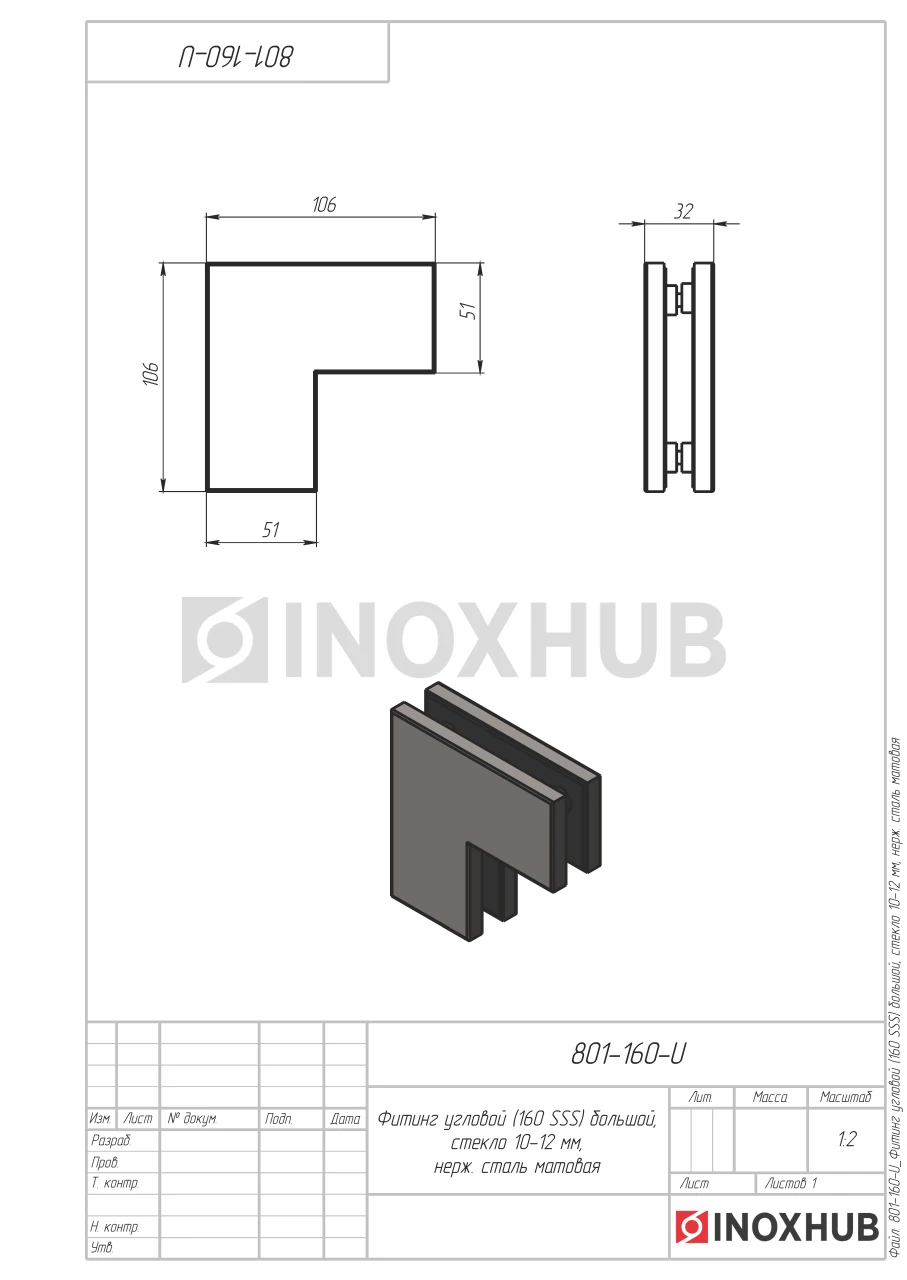 Фитинг угловой (160 SSS) большой, стекло 10-12 мм, нерж. сталь матовая