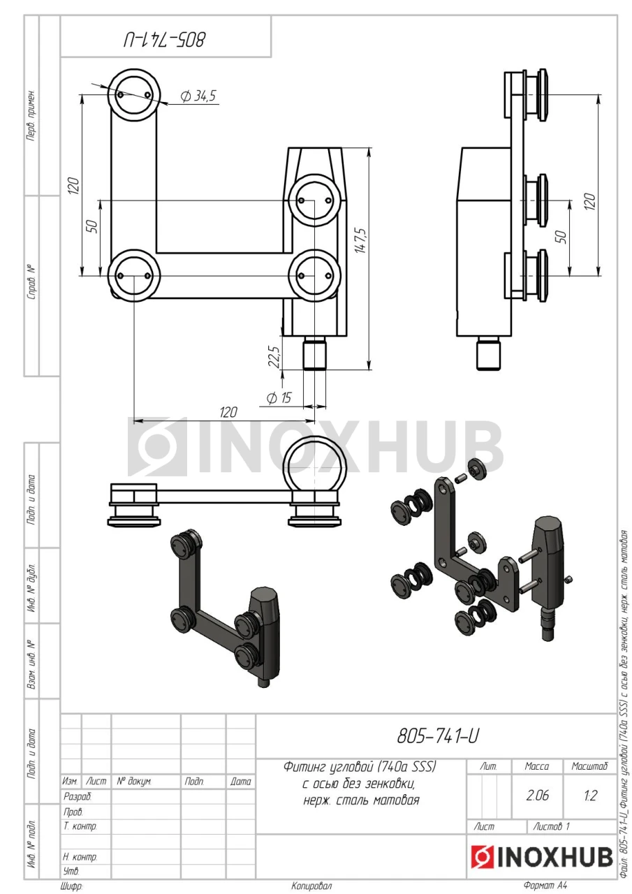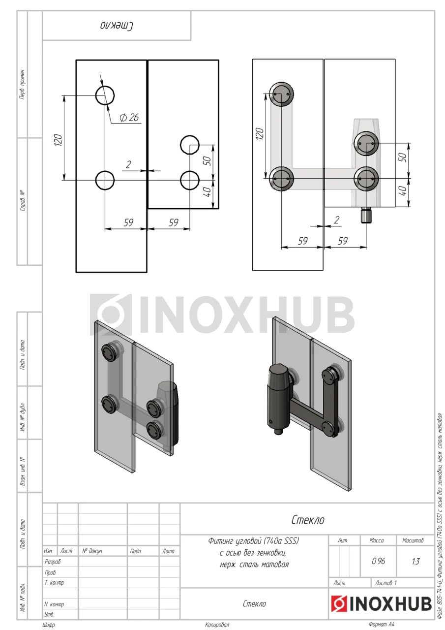 Фитинг угловой (740a SSS) с осью без зенковки, нерж. сталь матовая