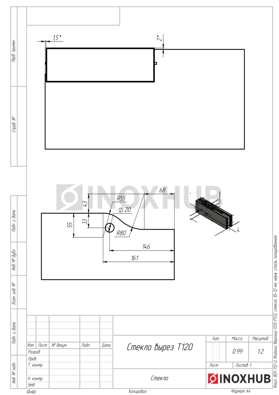 Фитинг верхний (120 PSS), стекло 10-12 мм, нерж. сталь полированная