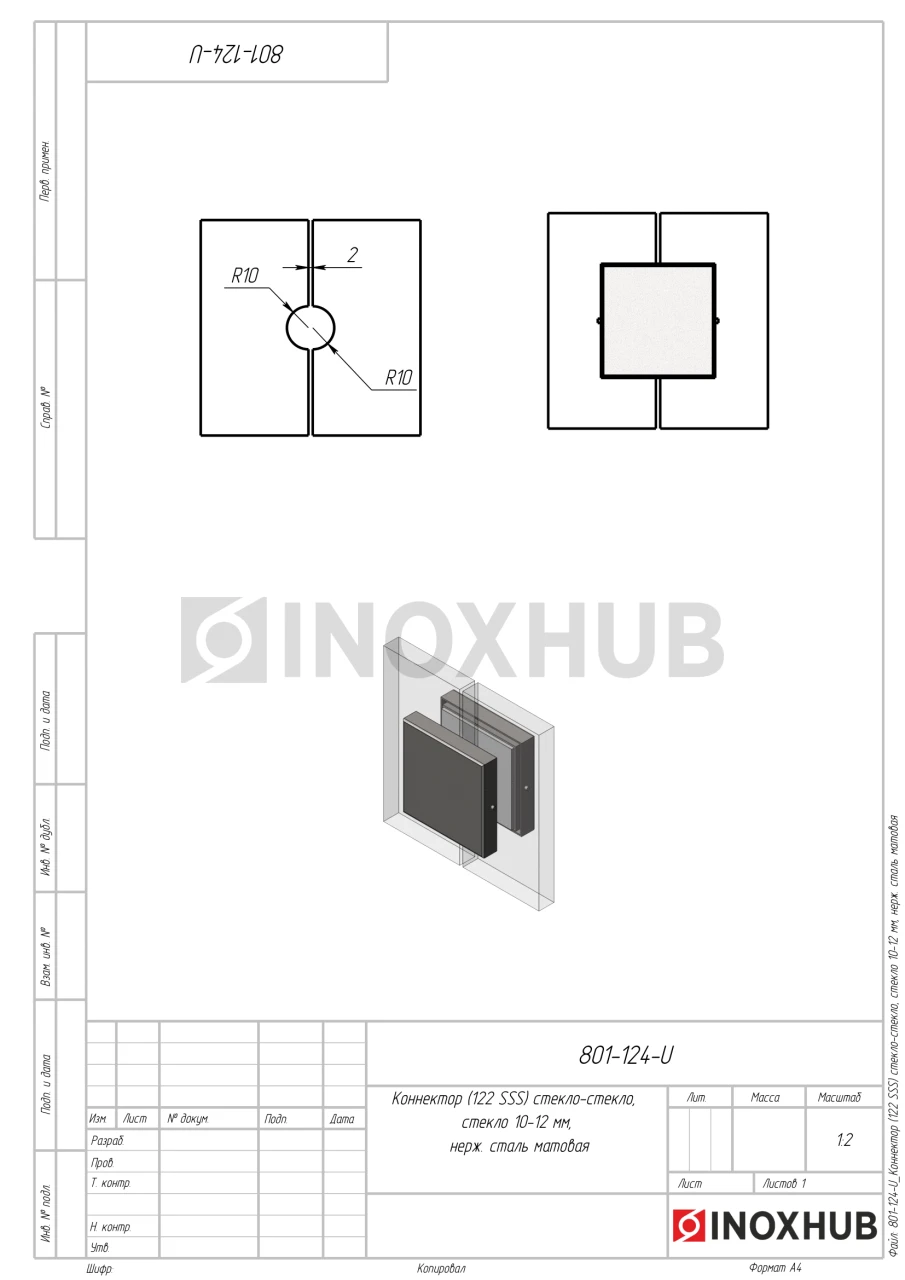 Коннектор (122 SSS) стекло-стекло, стекло 10-12 мм, нерж. сталь матовая