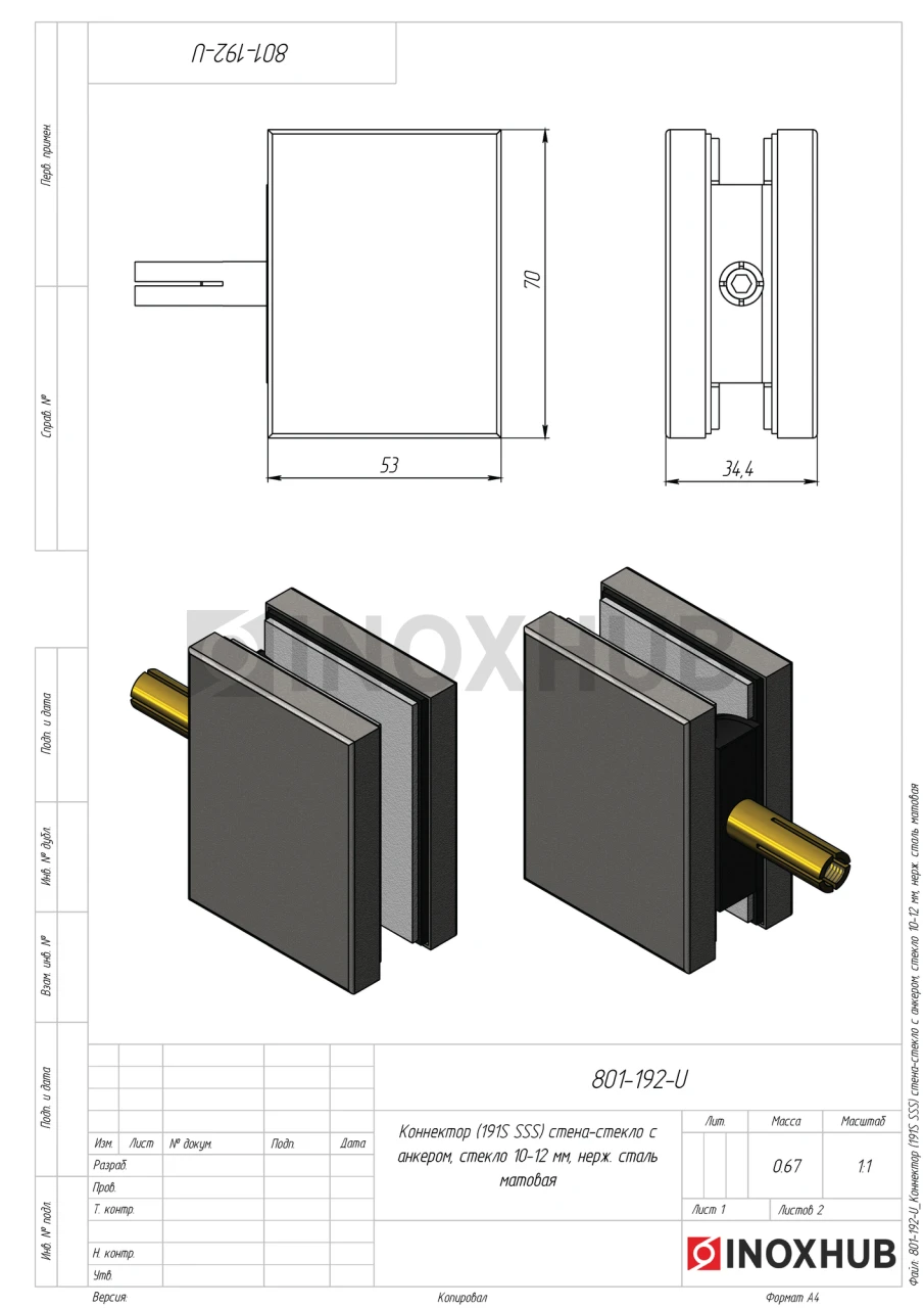 Коннектор (191S SSS) стена-стекло с анкером, стекло 10-12 мм, нерж. сталь матовая