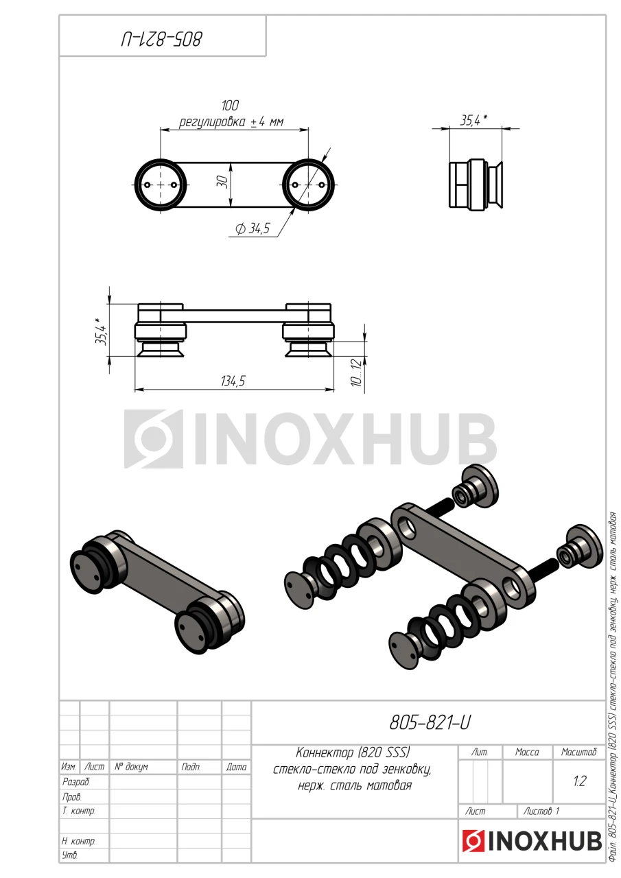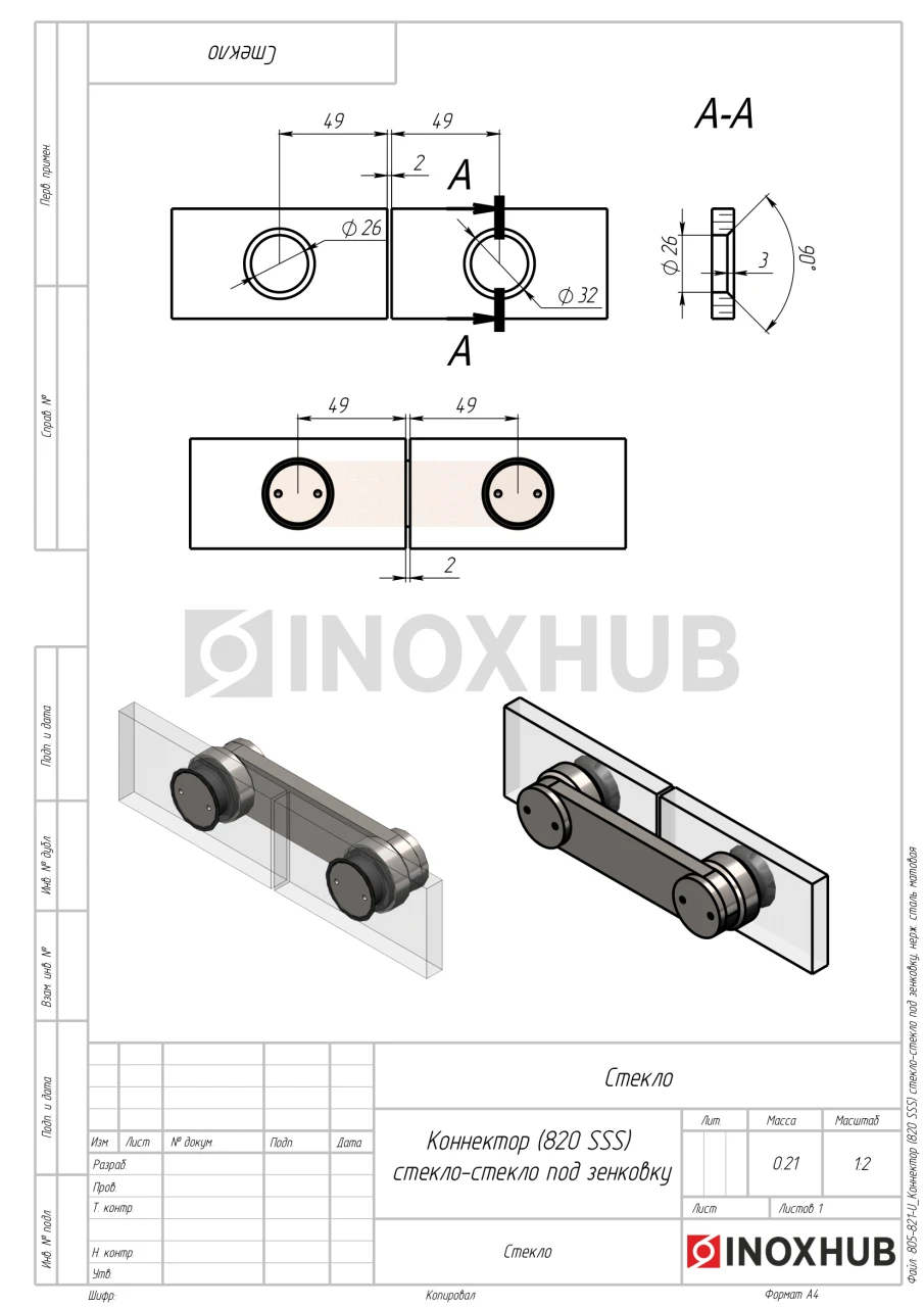 Коннектор (820 SSS) стекло-стекло под зенковку, нерж. сталь матовая