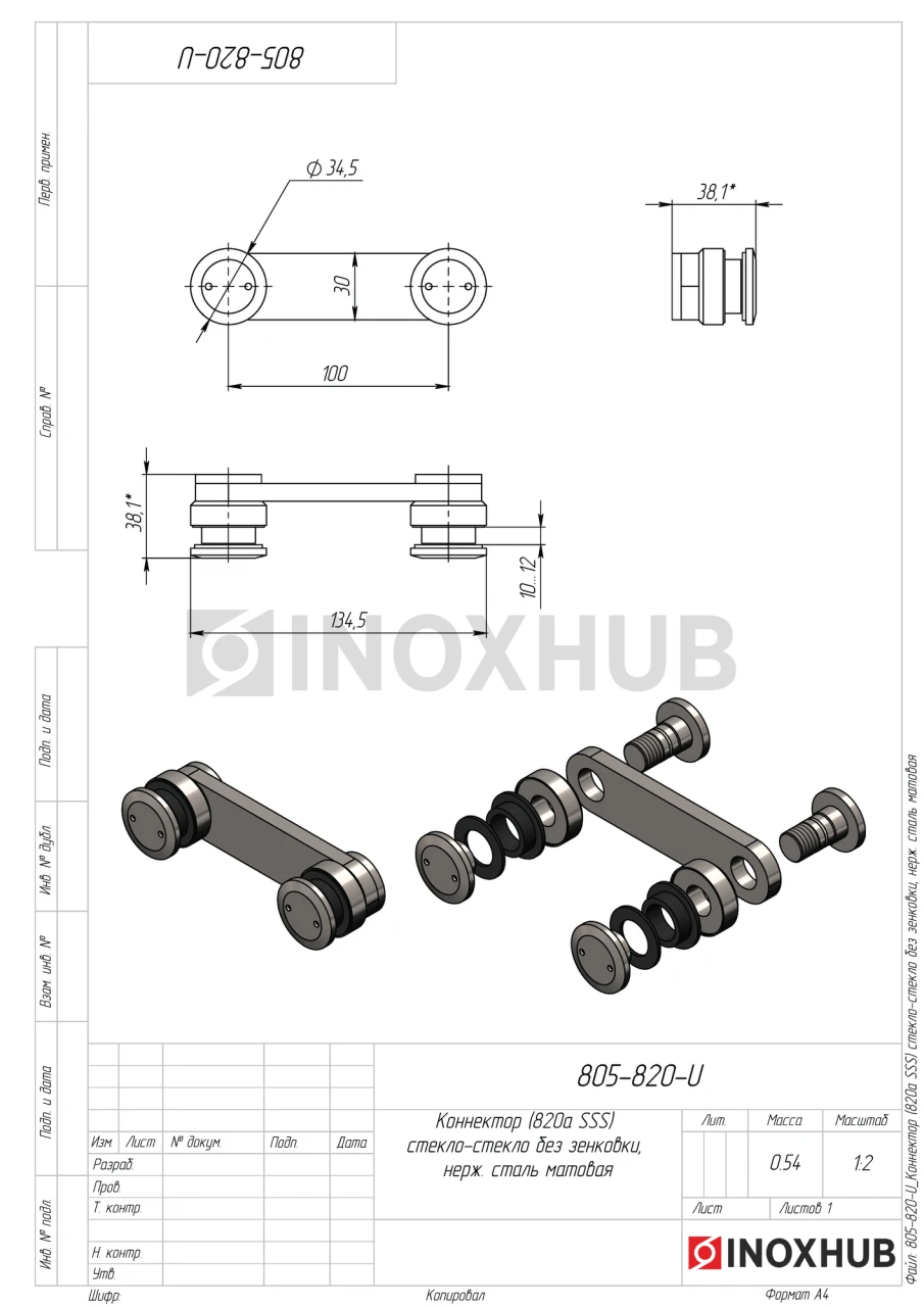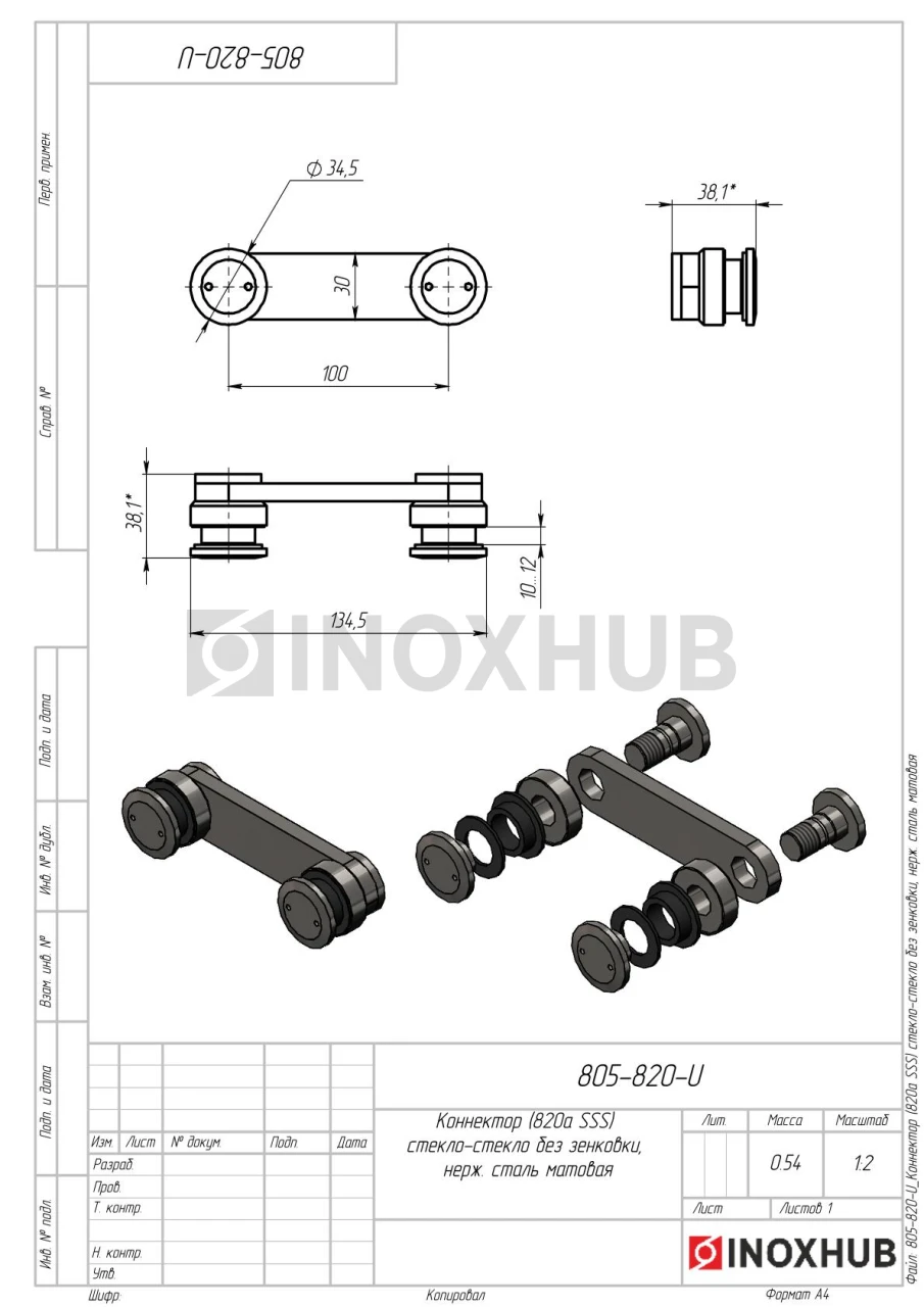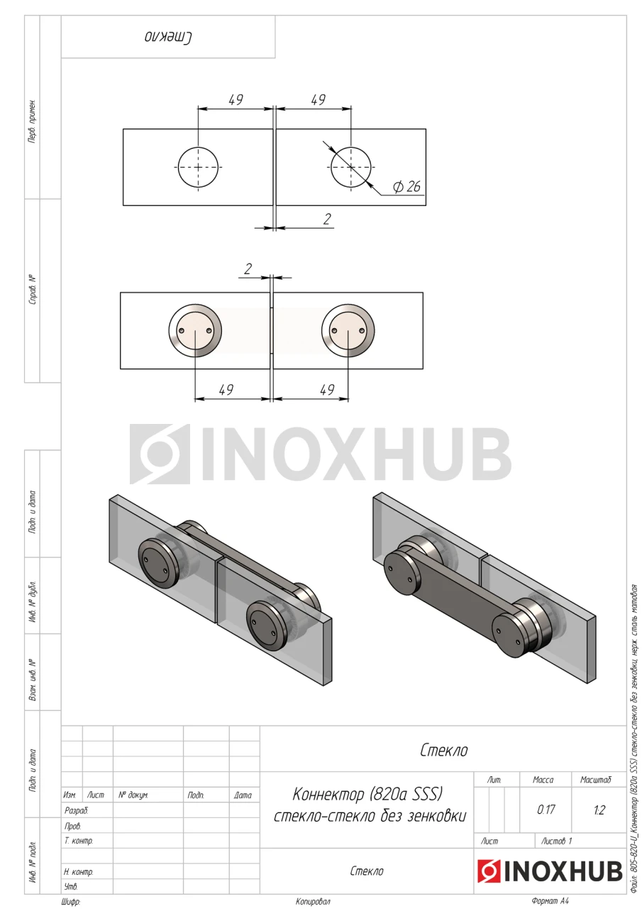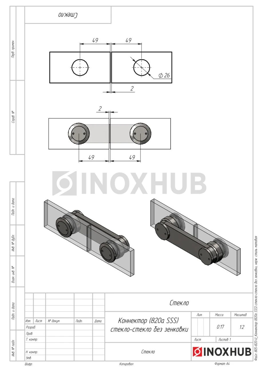 Коннектор (820а SSS) стекло-стекло без зенковки, нерж. сталь матовая