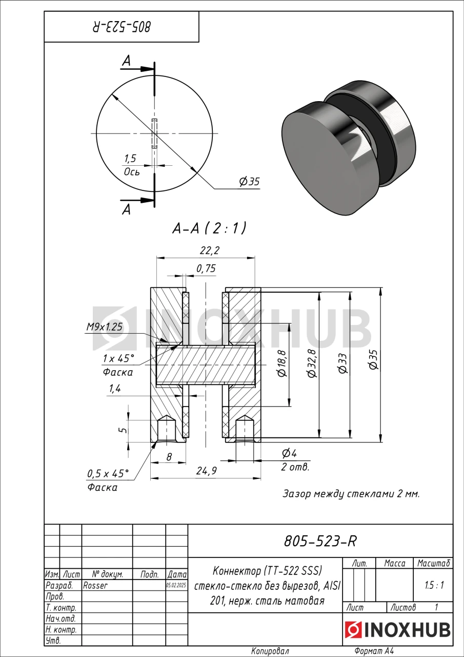 Коннектор (ТТ-522 SSS) стекло-стекло без вырезов, AISI 201, нерж. сталь матовая