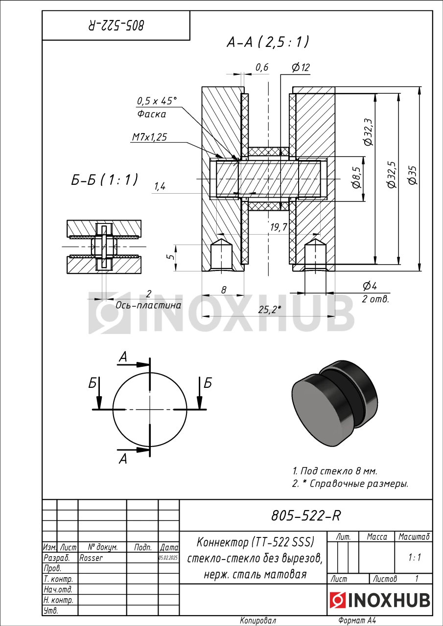 Коннектор (ТТ-522 SSS) стекло-стекло без вырезов, нерж. сталь матовая