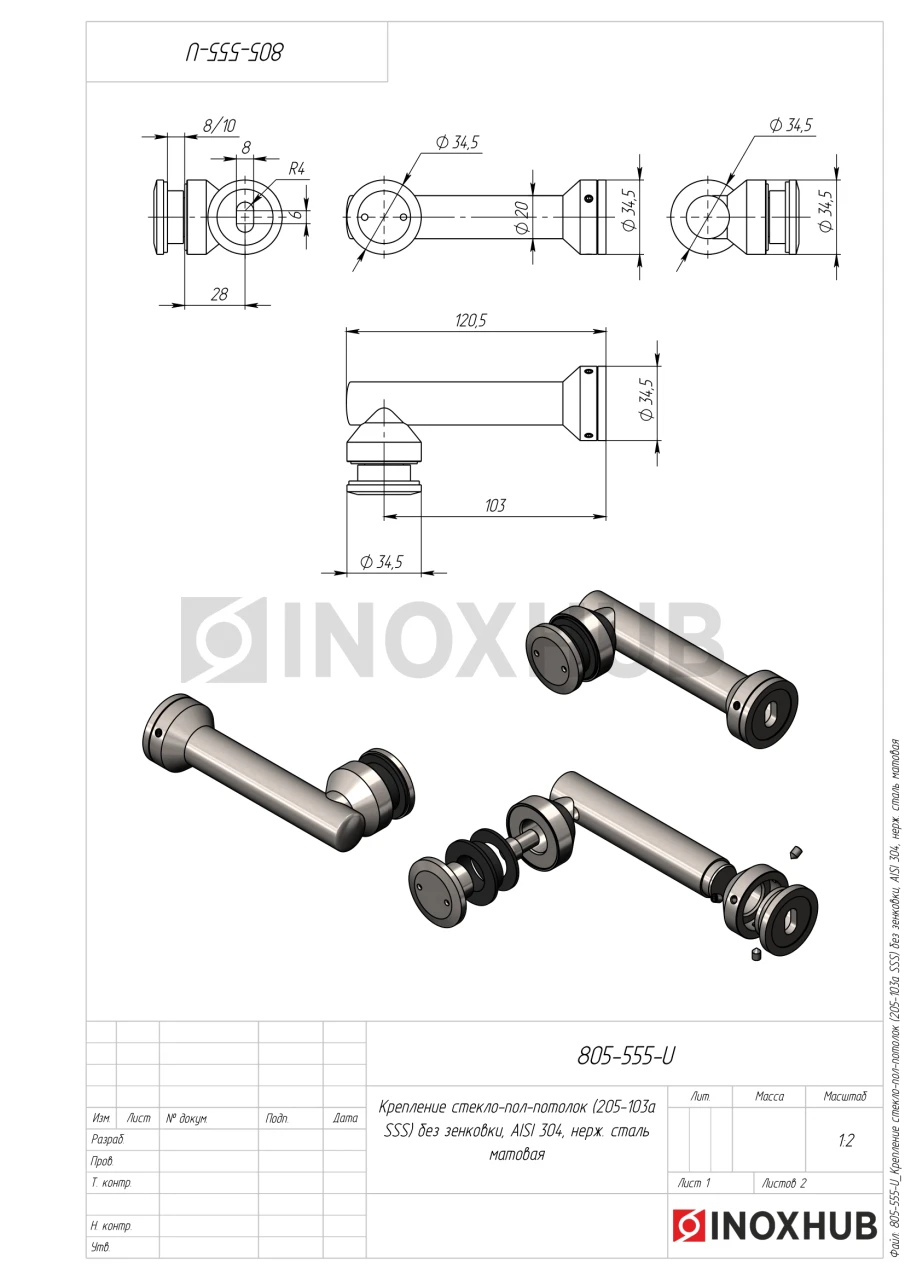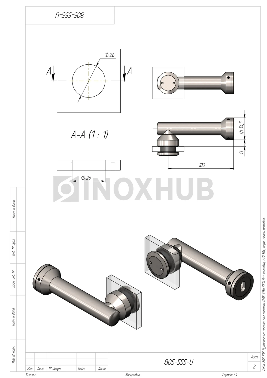 Крепление стекло-стена (205-103а SSS) без зенковки, AISI 304, нерж. сталь матовая