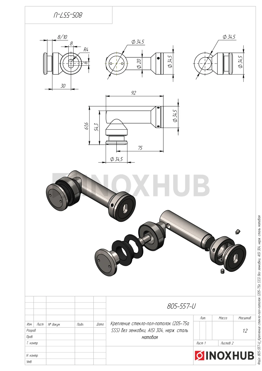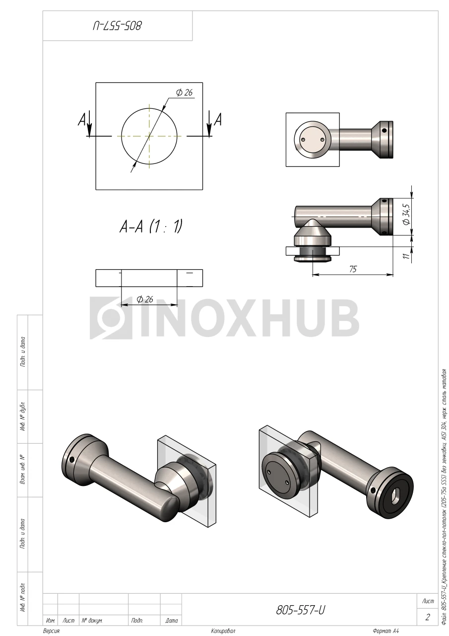 Крепление стекло-стена (205-75а SSS) без зенковки, AISI 304, нерж. сталь матовая