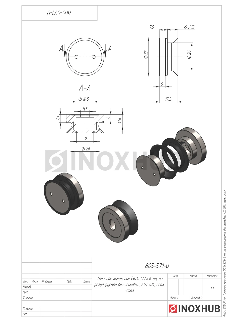 Точечное крепление (501 SSS) не регулируемое под зенковку, 6 мм, матовая нерж. сталь