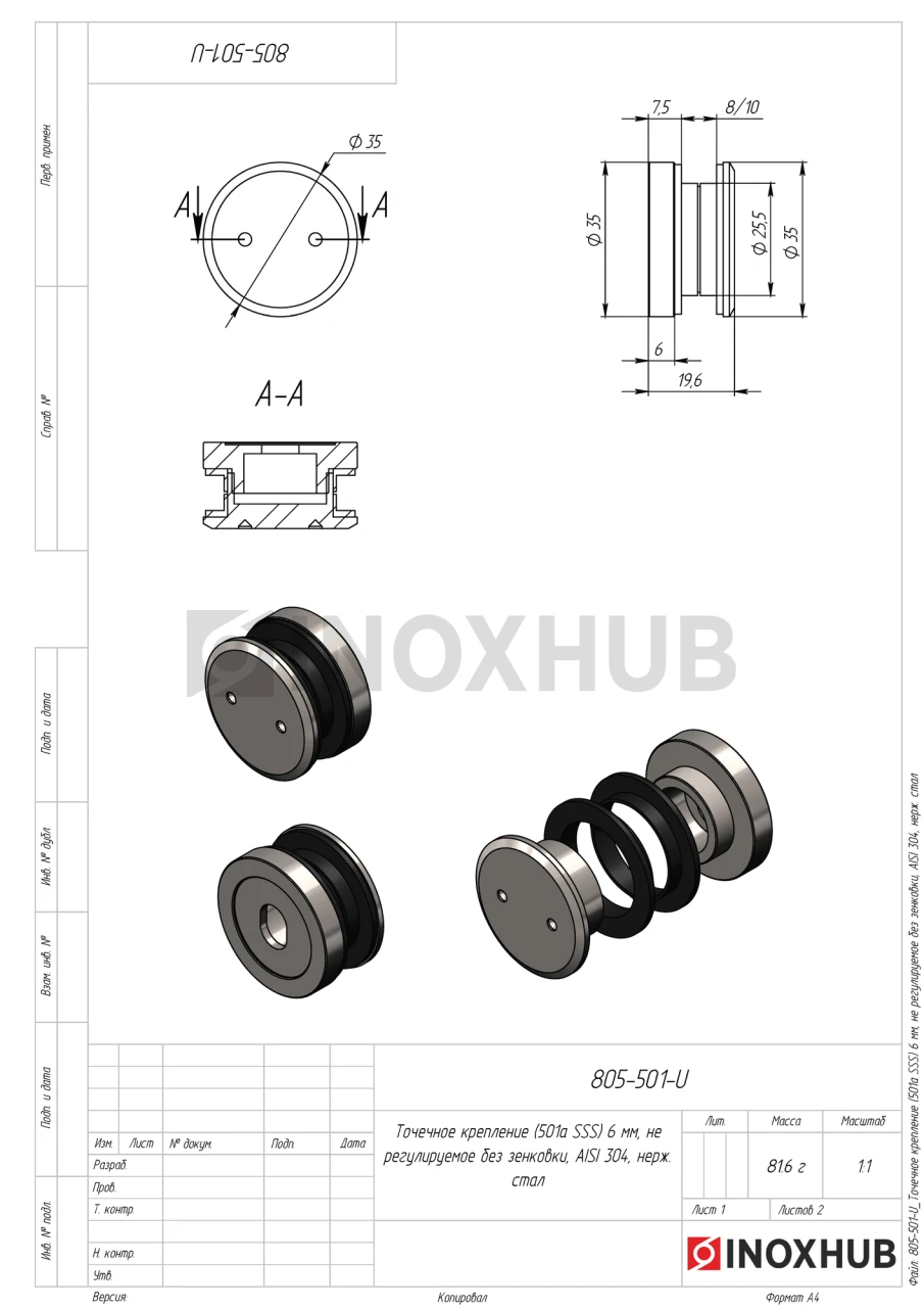 Точечное крепление (501a SSS) не регулируемое без зенковки, 6 мм, матовая нерж. сталь