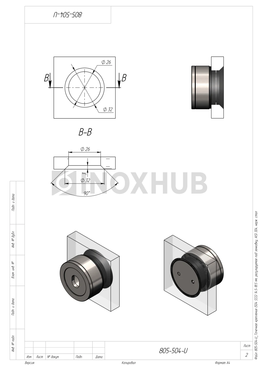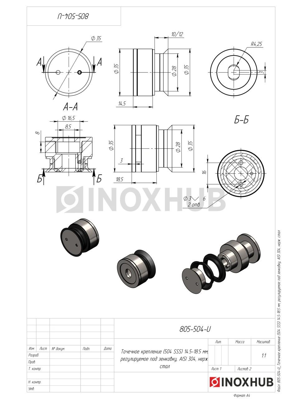 Точечное крепление (504 SSS) 14.5-18.5 мм, регулируемое под зенковку, AISI 304, нерж. сталь матовая