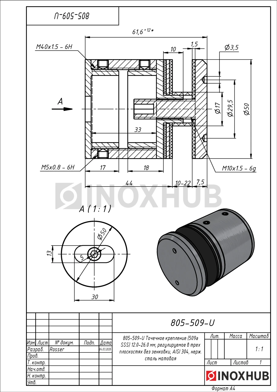 Точечное крепление (509a SSS) 12.0-26.0 мм, регулируемое в трех плоскостях без зенковки, AISI 304, нерж. сталь матовая