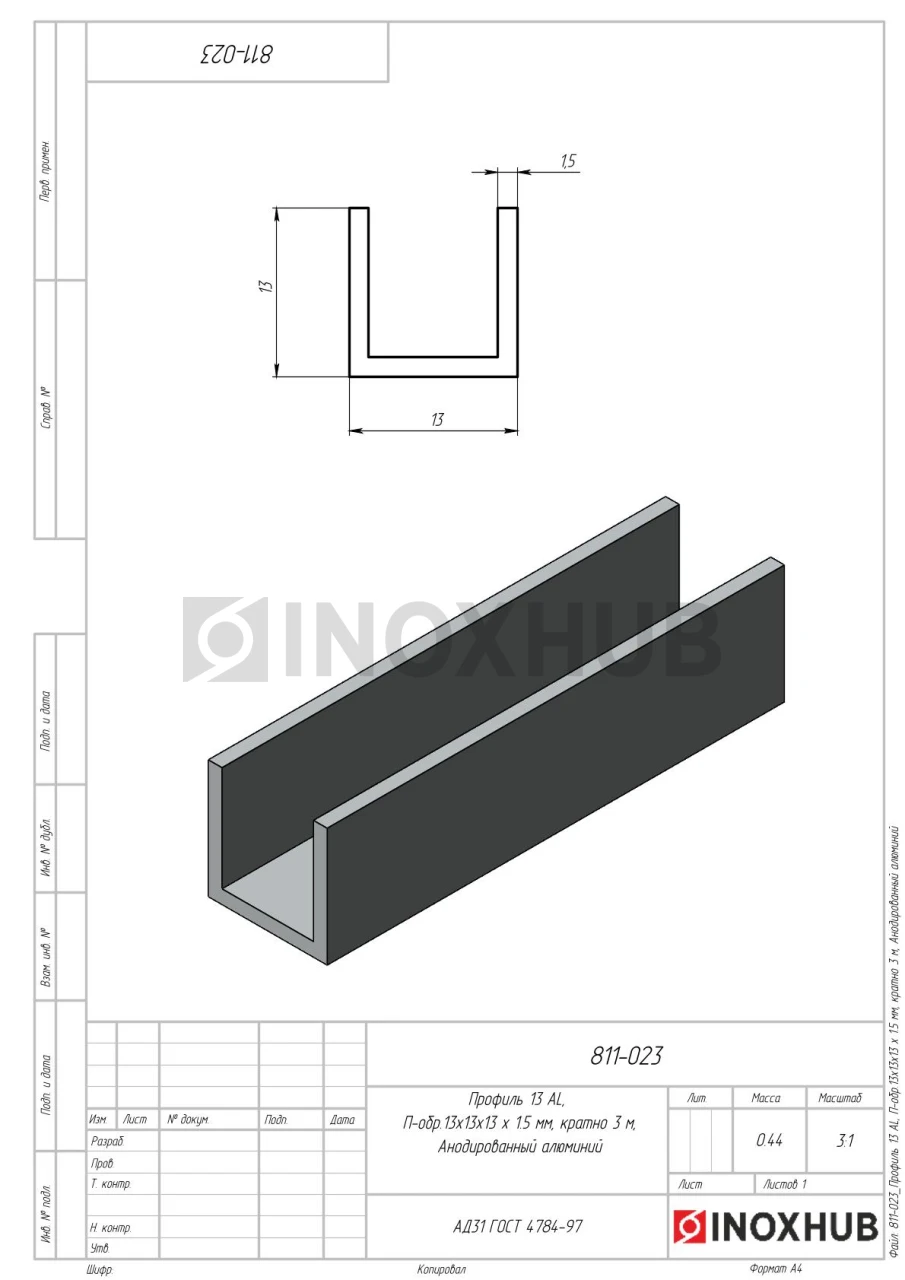 П швеллер 13 AL, 13×13×13×1.5 мм, кратно 3 м, Анодированный алюминий