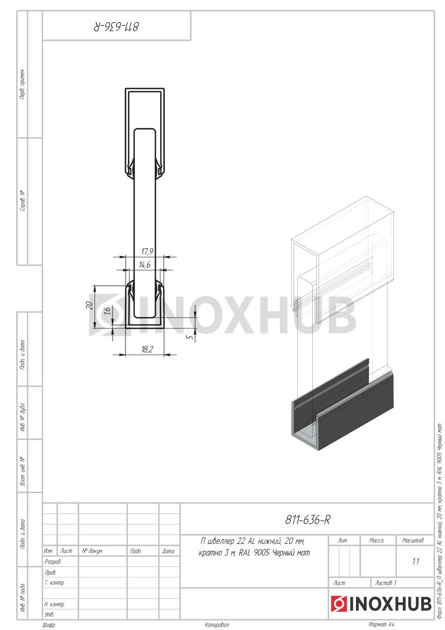 П швеллер 22 AL нижний, 20 мм, кратно 3 м, RAL 9005 Черный мат