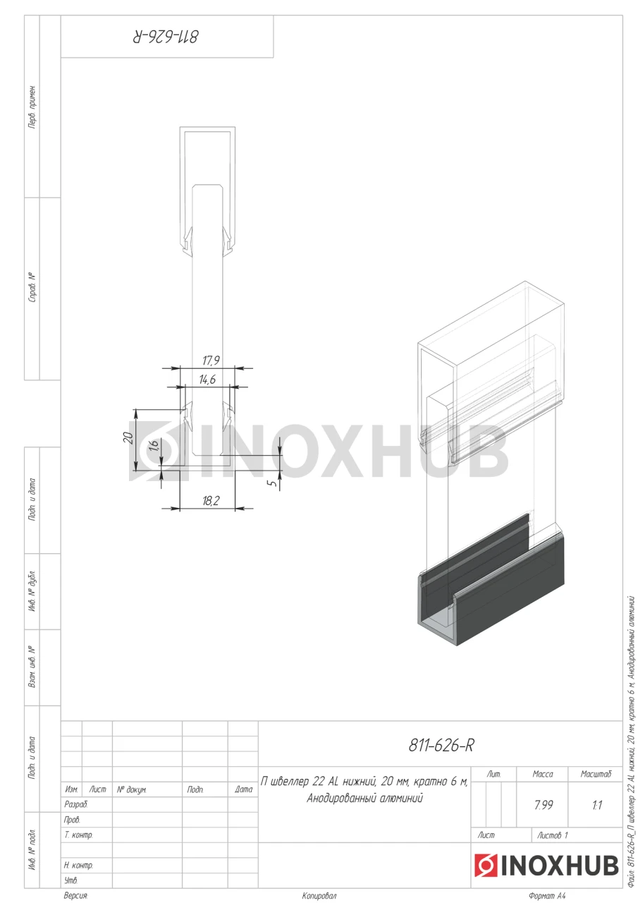 П швеллер 22 AL нижний, 20 мм, кратно 6 м, Анодированный алюминий
