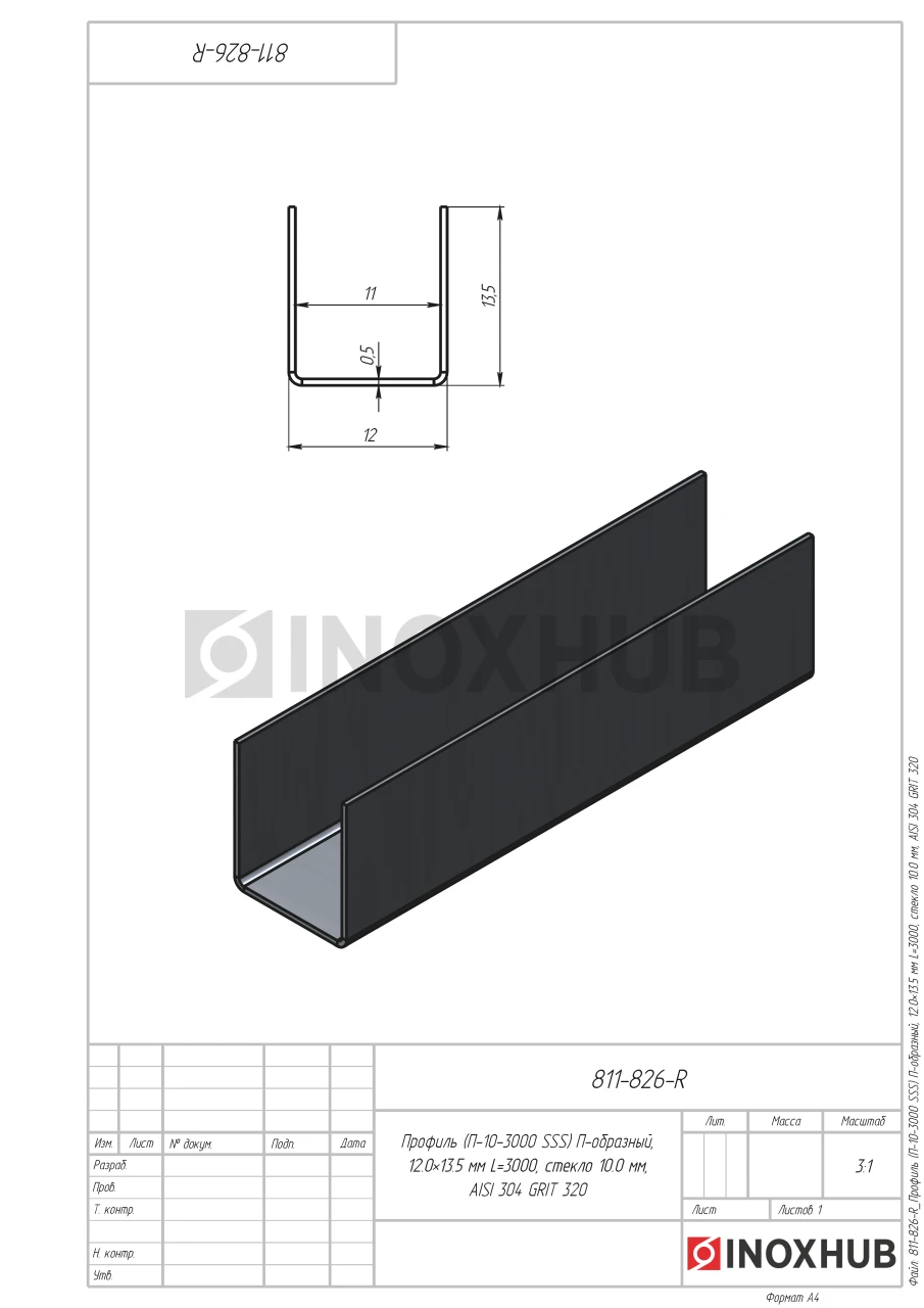 Профиль (П-10-3000 SSS) П-образный, 12.0×13.5 мм L=3000, стекло 10.0 мм, AISI 304 GRIT 320