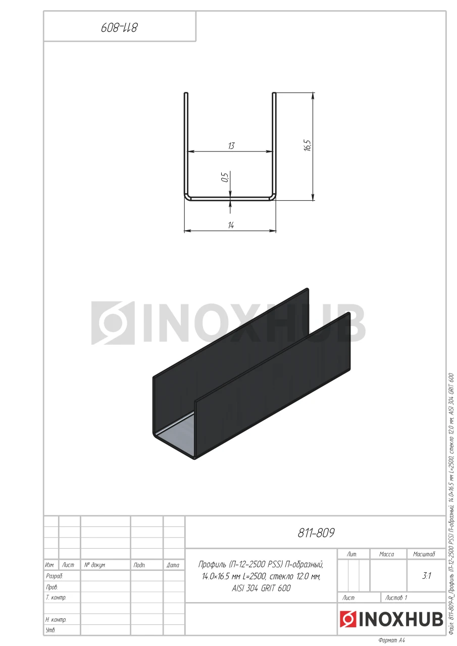 Профиль (П-12-2500 PSS) П-образный, 14.0×16.5 мм L=2500, стекло 12.0 мм, AISI 304 GRIT 600