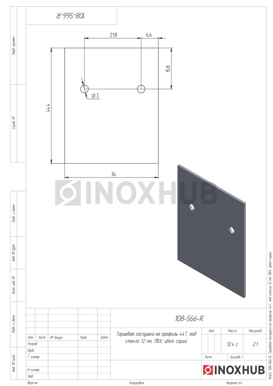 Торцевая заглушка на профиль 44Т, под стекло 12 мм, не анодированный алюминий