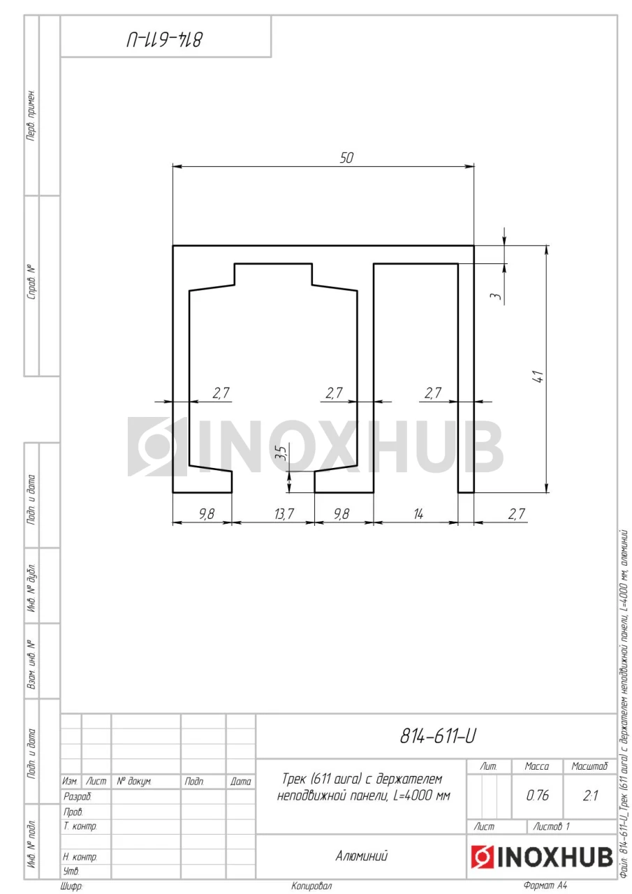Трек (611-4000) с держателем неподвижной панели, L=4000 мм, Анодированный алюминий