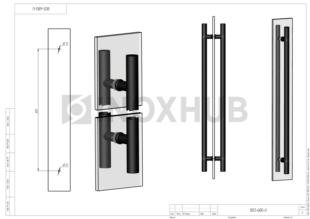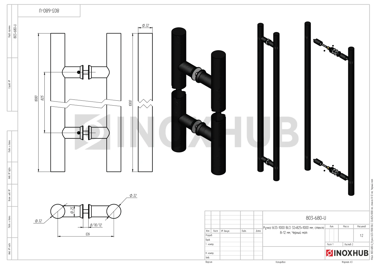 Ручка (633-1000 BLC) 32×825×1000 мм, стекло 8-12 мм, Черный мат