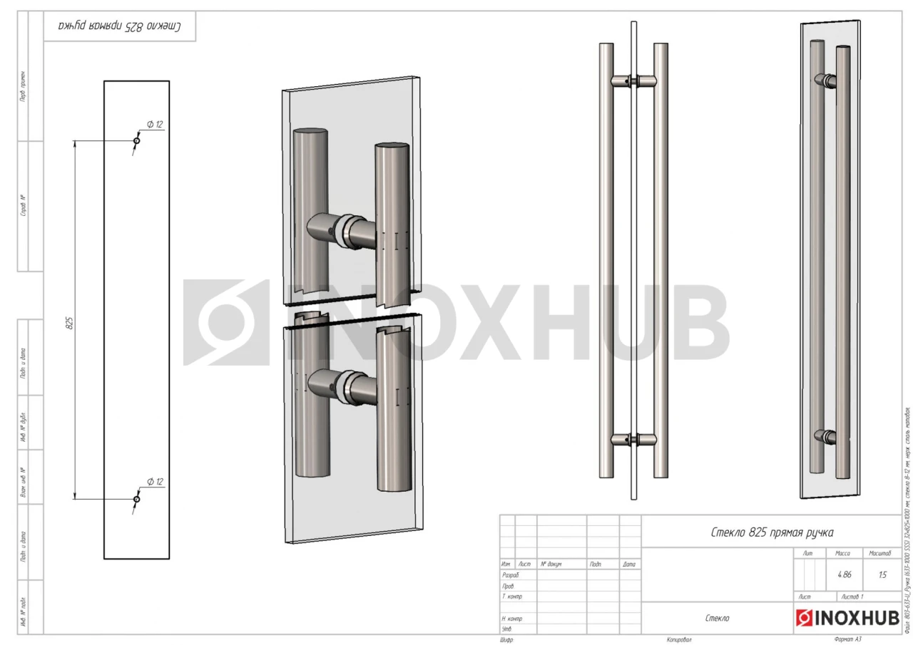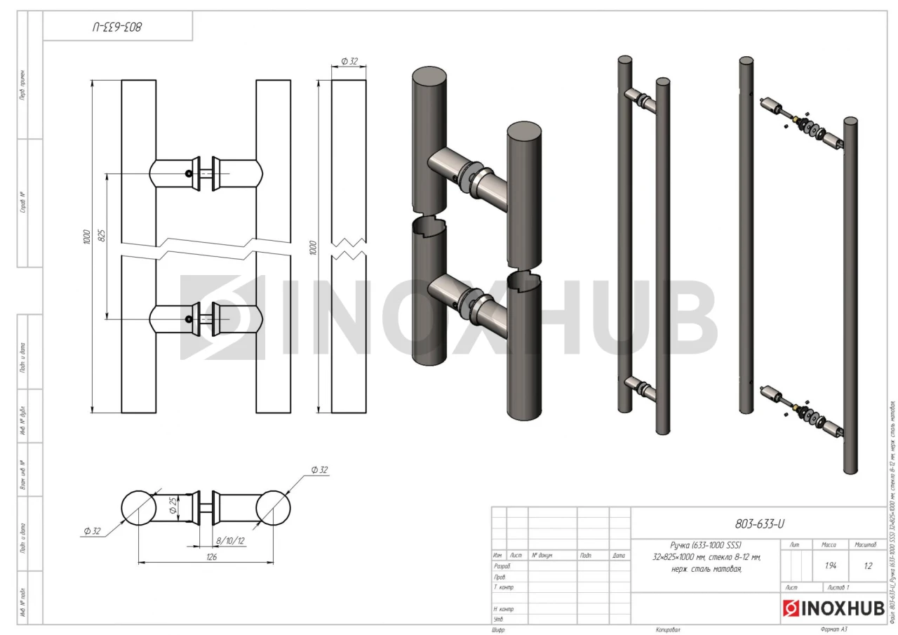 Ручка (633-1000 SSS) 32×825×1000 мм, стекло 8-12 мм, нерж. сталь матовая