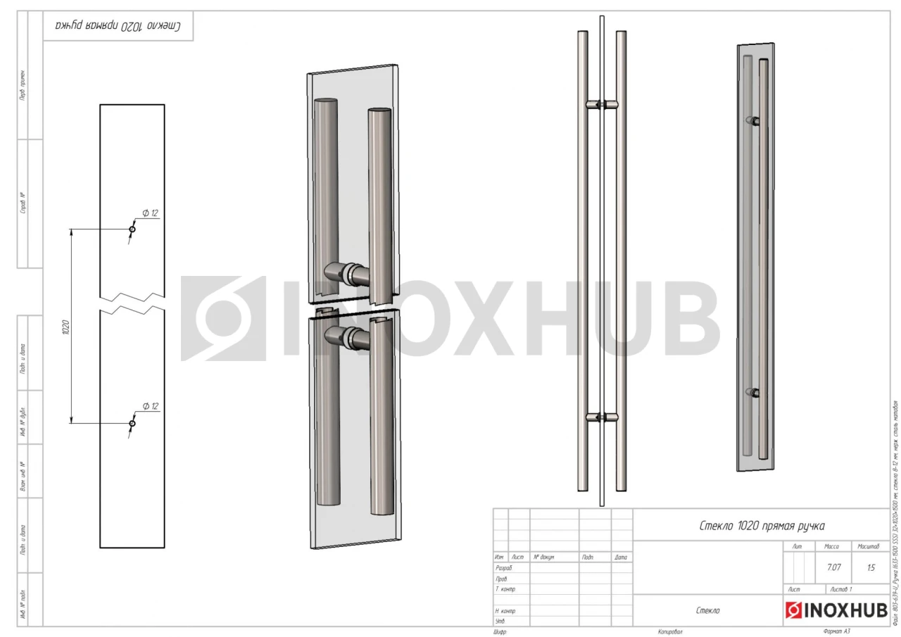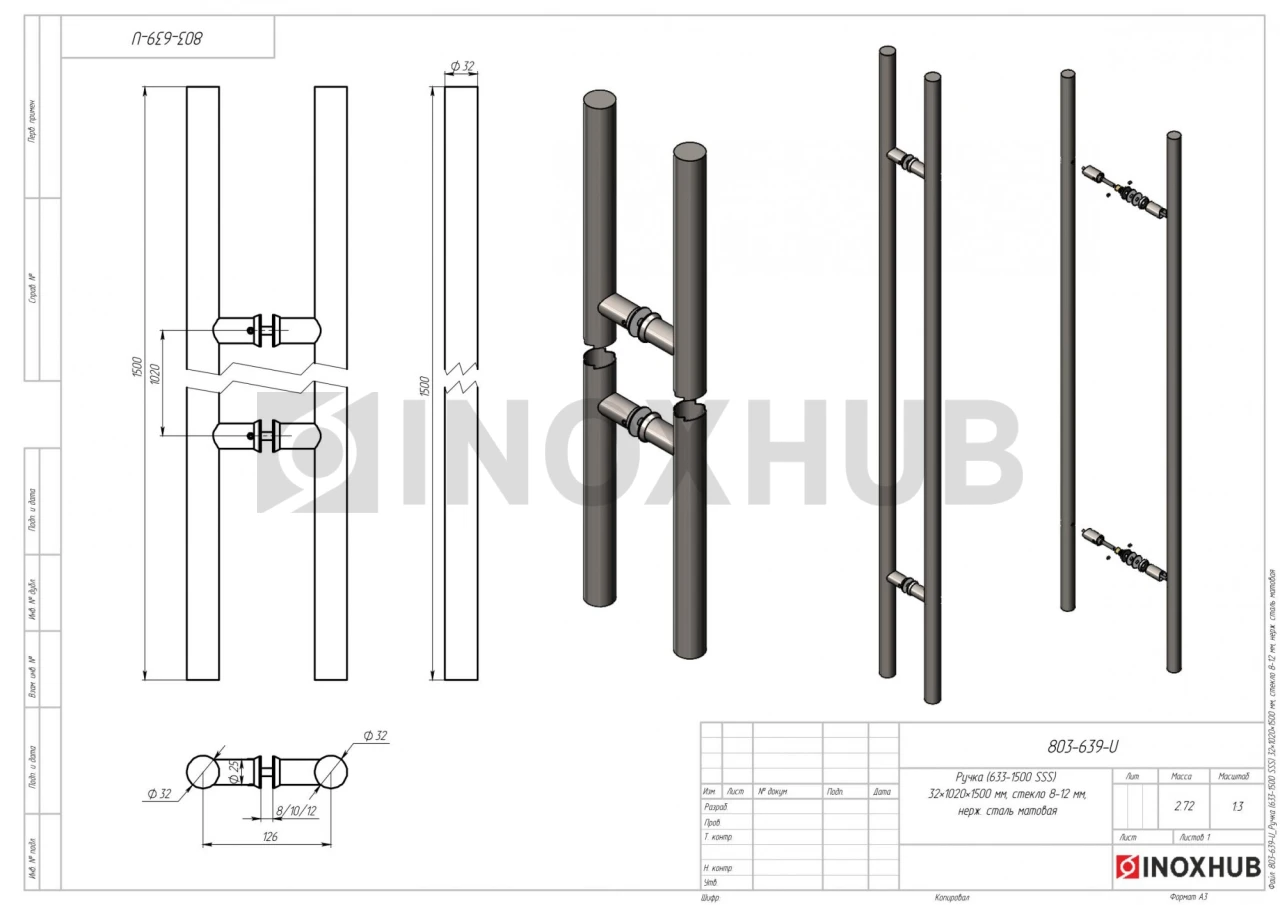 Ручка (633-1500 SSS) 32×1020×1500 мм, стекло 8-12 мм, нерж. сталь матовая
